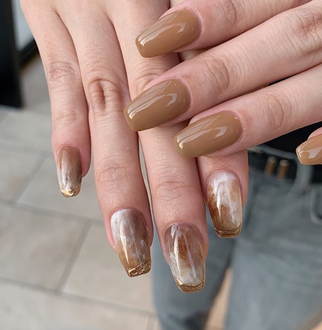 第一款就頒發給小編私心最愛的「融化大理石」啦!這款美甲一次結合琥珀色、咖啡色、卡其色以及經典的奶茶色,除了奶茶色在指甲最外圍包邊之外,更把白色元素融入琥珀色裡,暈染出一種牛奶正在融化的拉花拿鐵感,看起來就像半融化的大理石,一點一點改變顏色真的是太美啦!