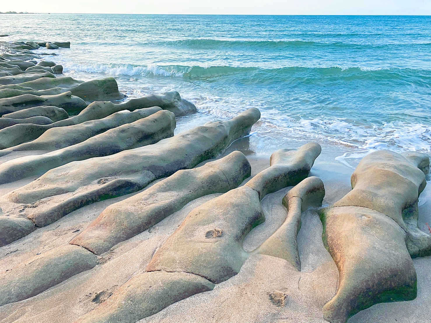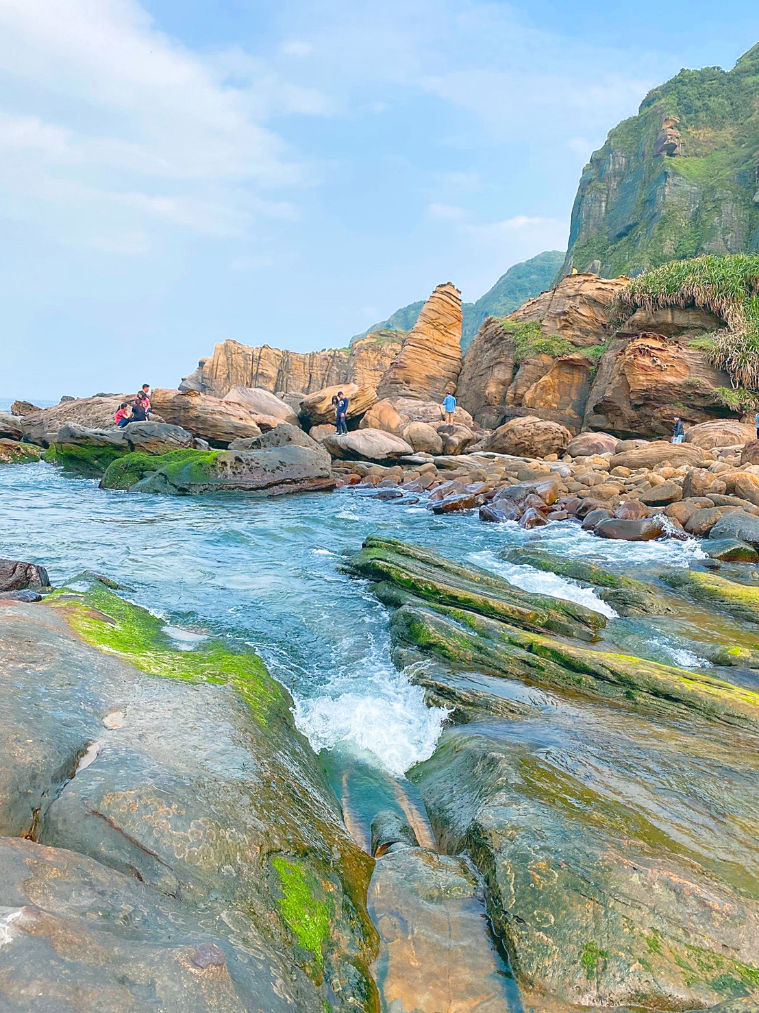 「老梅石槽」的景色真的非常漂亮!同時擁有細緻沙灘與被侵蝕的岩岸,形成一道道總長將近2公里,平均深度大約50公分的溝槽,據說最美的景觀通常出現在3月中旬到5月上旬,尤其4月清明期間會最美!整個海岸溝槽上面會附滿海藻,形成一條又一條的「綠石槽」,把整個海岸染成萌萌的鮮綠色,也難怪拍起照來每個人都能秒變網美!