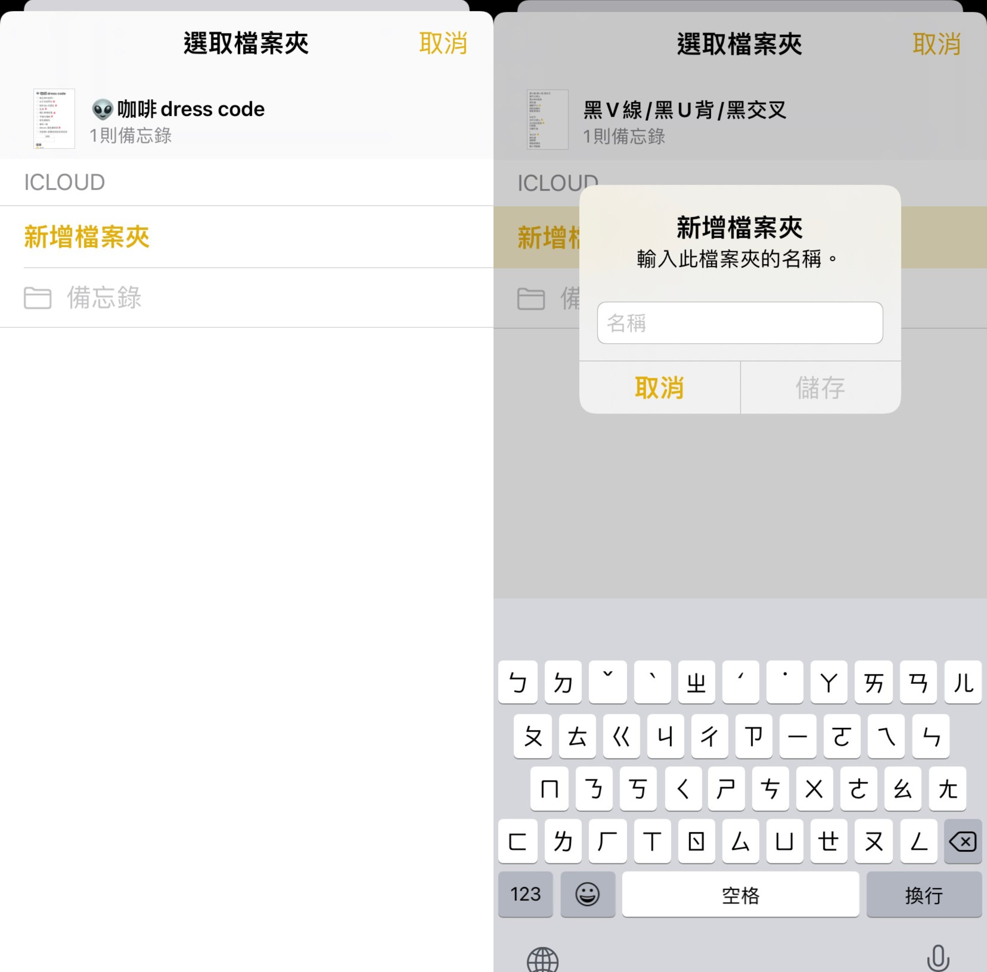 對於一整排備忘錄,有時候看了真的會頭痛!若想歸納到分類的資料夾中,直接按著備忘錄往左滑動,點選「紫色檔案夾」圖案,就能夠快速進入到新增檔案夾的地區,更可以自己取名稱,整合成共享一個「資料夾」,好好分門別類未來要找就更方便啦!