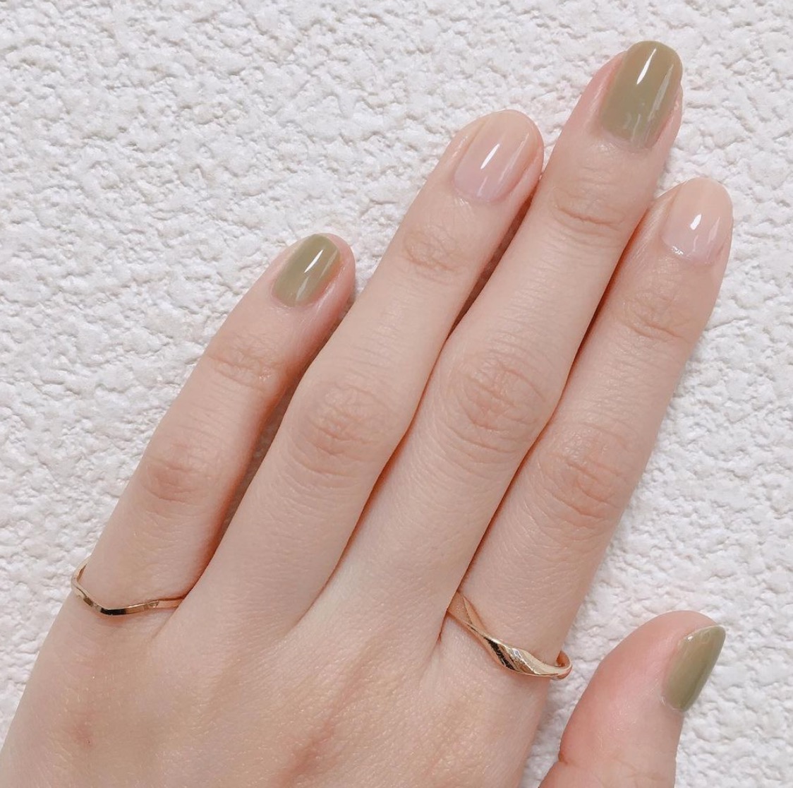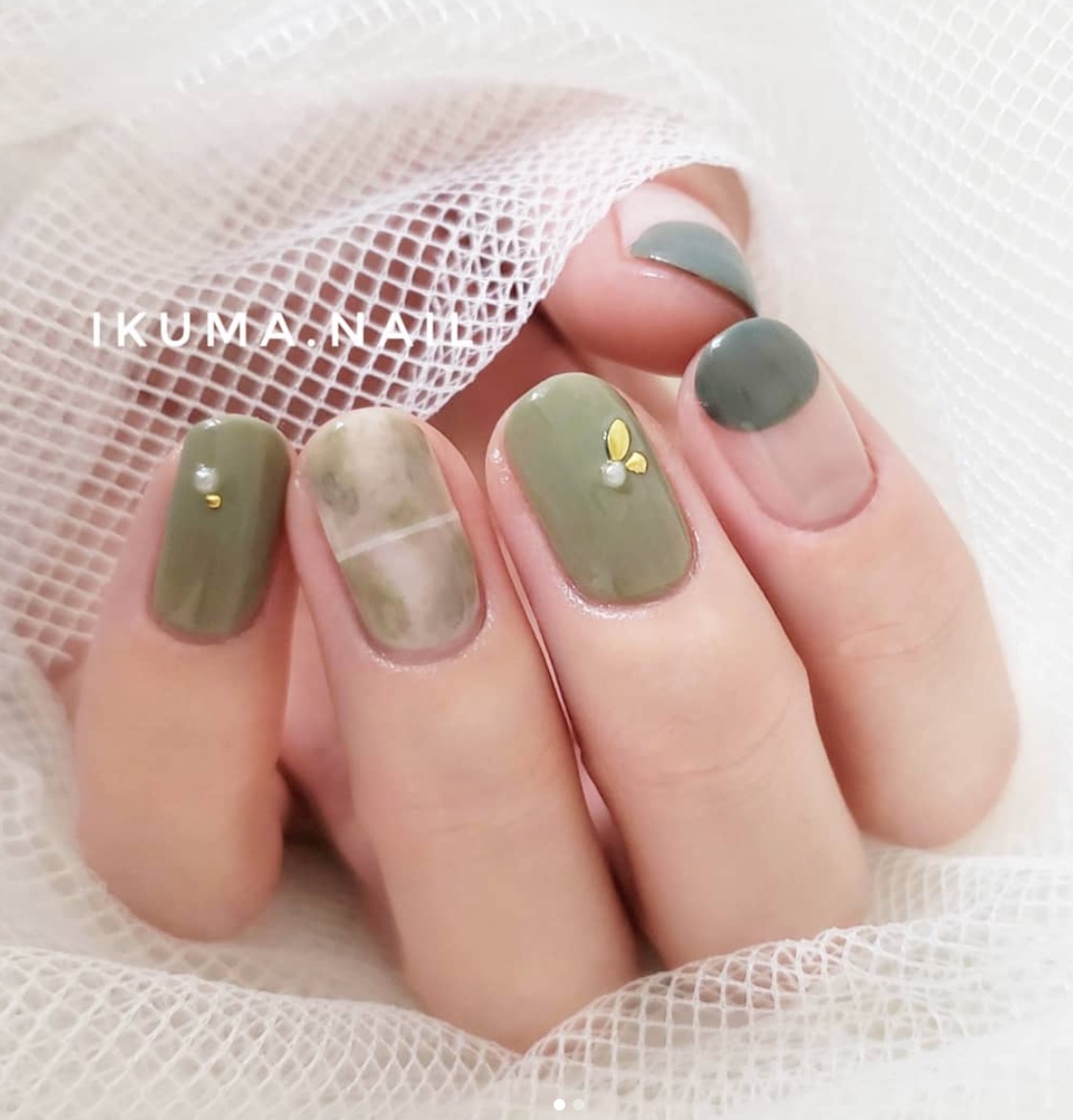 綠色也是可以加入大理石的暈染風喔!很推薦大家嘗試看看這款以各種不同色階綠色所組成的搭配,尤其在大拇指跟食指上點綴上灰綠,看起來更沉穩有氣質,加上部分留白就不會太厚重,是很適合微涼春季的一款~