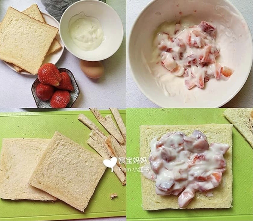 草莓適量、吐司適量、雞蛋1-2個、優格約350g、糖粉適量