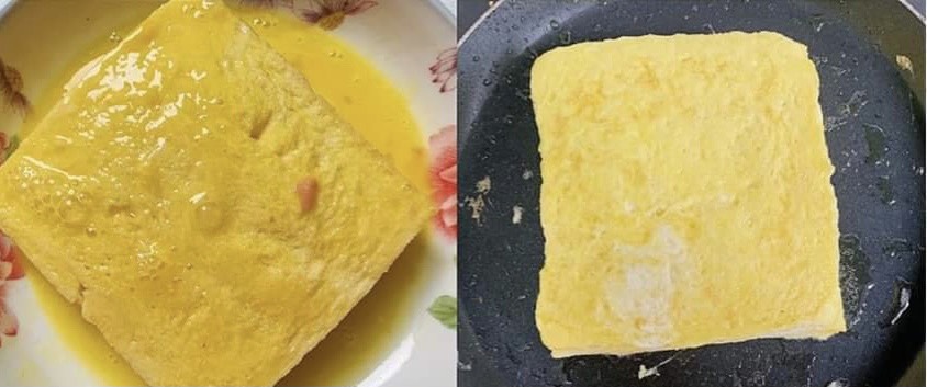 步驟四:準備另一個盤子,打一至兩顆蛋黃打散,將剛剛的吐司完全浸泡至蛋液中,再放置平底鍋上煎,擔心燒焦的話可以在平底鍋上抹一層薄薄的奶油,吐司煎至表皮呈現金黃色的光澤,就可以準備起鍋了!