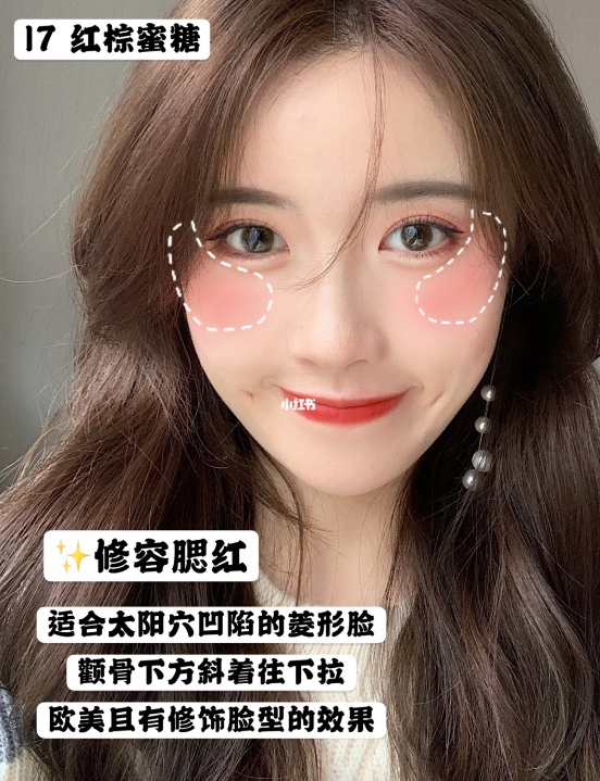 首先是基本款的「修容腮紅法」,腮紅不僅可以提升氣色,也能當作自然的修容色呢!這款畫法適合臉型較銳利、太陽穴凹陷的菱形臉,由顴骨處往上畫,屬於比較歐美風格的妝容,但也能很好地修飾臉型!