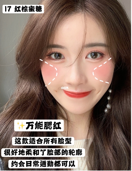 萬能腮紅適合所有臉型的畫法,面積又比日常腮紅多了一些,顏色最深的地方大約會落在眼尾的位置,接著慢慢往外擴散,完美的柔和臉部的線條,適合所有美妝新手呢!