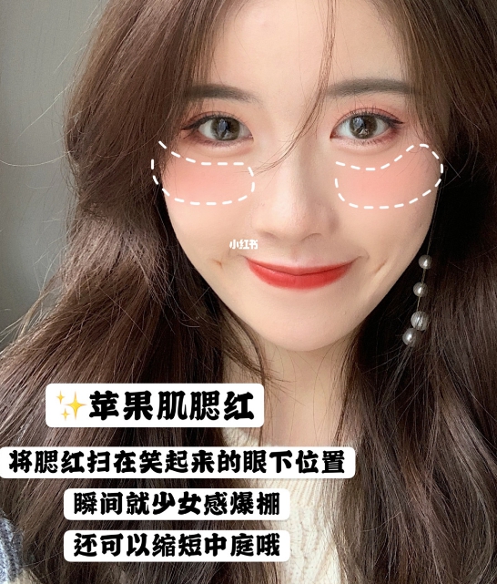 「蘋果肌腮紅」又稱「眼下腮紅」,這種腮紅適合想走可愛、少女路線的妝容,將腮紅橫掃在眼下的位置,來回慢慢上色,瞬間少女感爆棚,約會必勝款就是它!