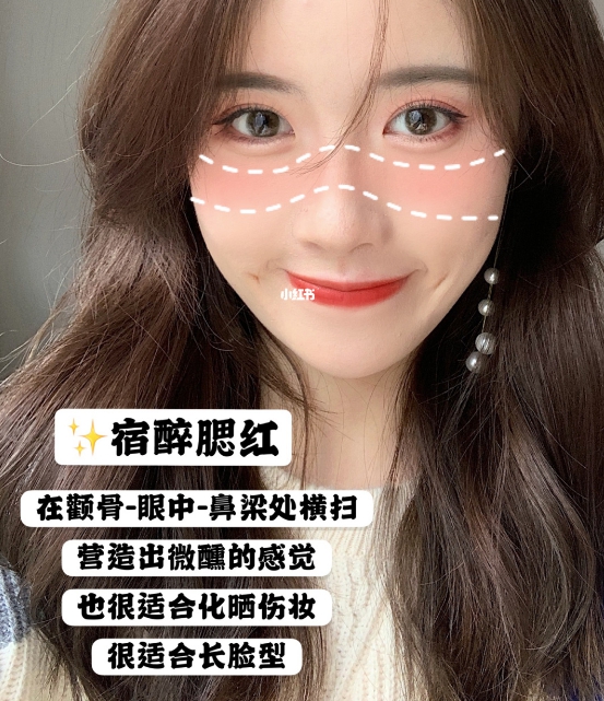 幾年前在日本爆紅的宿醉眼妝,今年流行的則是保留了腮紅的精華,在顴骨、眼中到鼻樑的位置橫掃,營造出一種微醺的妝感,給人一種楚楚可憐的感覺!這款腮紅畫法適合長臉的女孩,能夠將臉的比例調整,視覺上不會太拉長喔!
