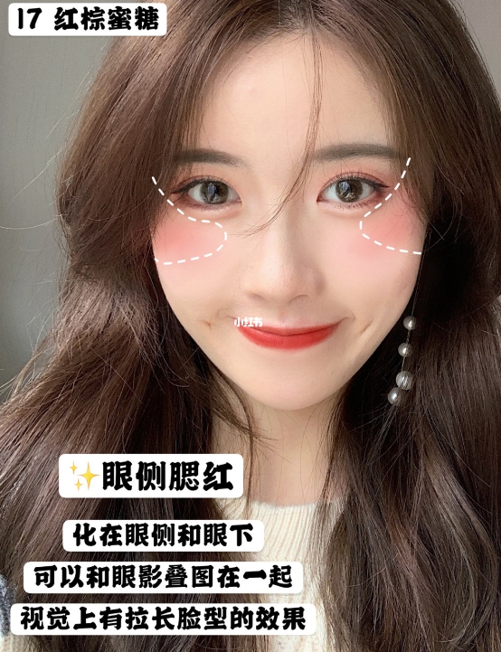 最後則是眼側腮紅,這款腮紅畫法是結合了眼影色,讓眼妝以及腮紅融合在一起的技巧,視覺上有拉長臉型的效果,圓臉女孩必學啦!