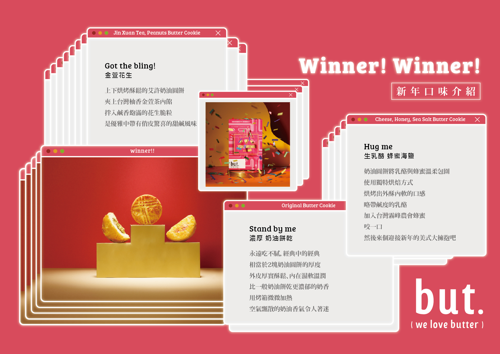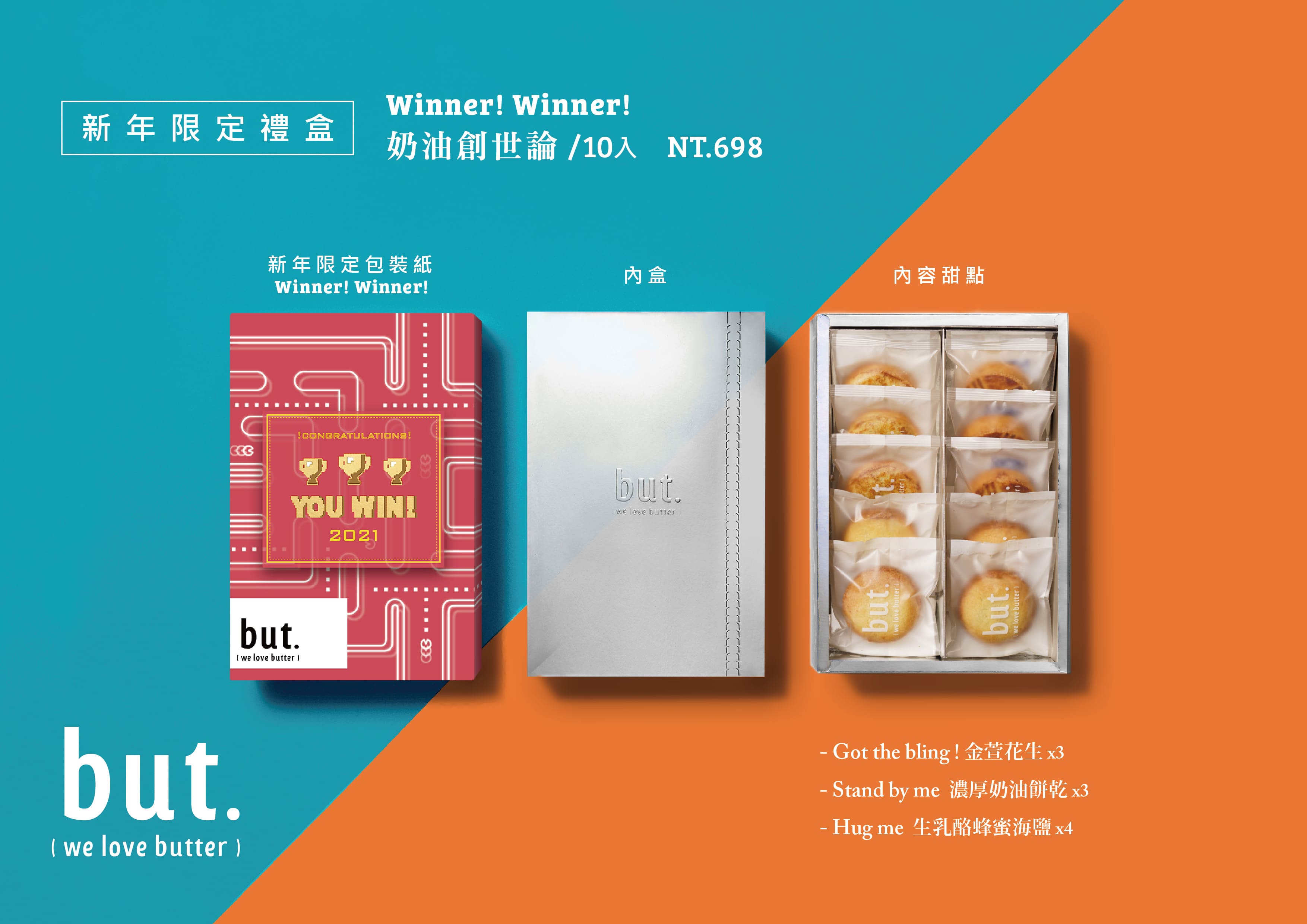 隱身在西裝店的IG超人氣法式奶油餅乾烘焙坊「but.we love butter」推出新年限定禮盒「Winner,Winner!! 奶油創世論」啦!裡面除了兩款人氣口味: Stand by me 濃厚奶油餅乾、Hug me 生乳酪蜂蜜海鹽,還有新口味Got the bling! 金萱花生,即日起到2月28日在官網開放訂購,無論是過年送禮,還是新的一年想犒賞自己,都快點下單吧!