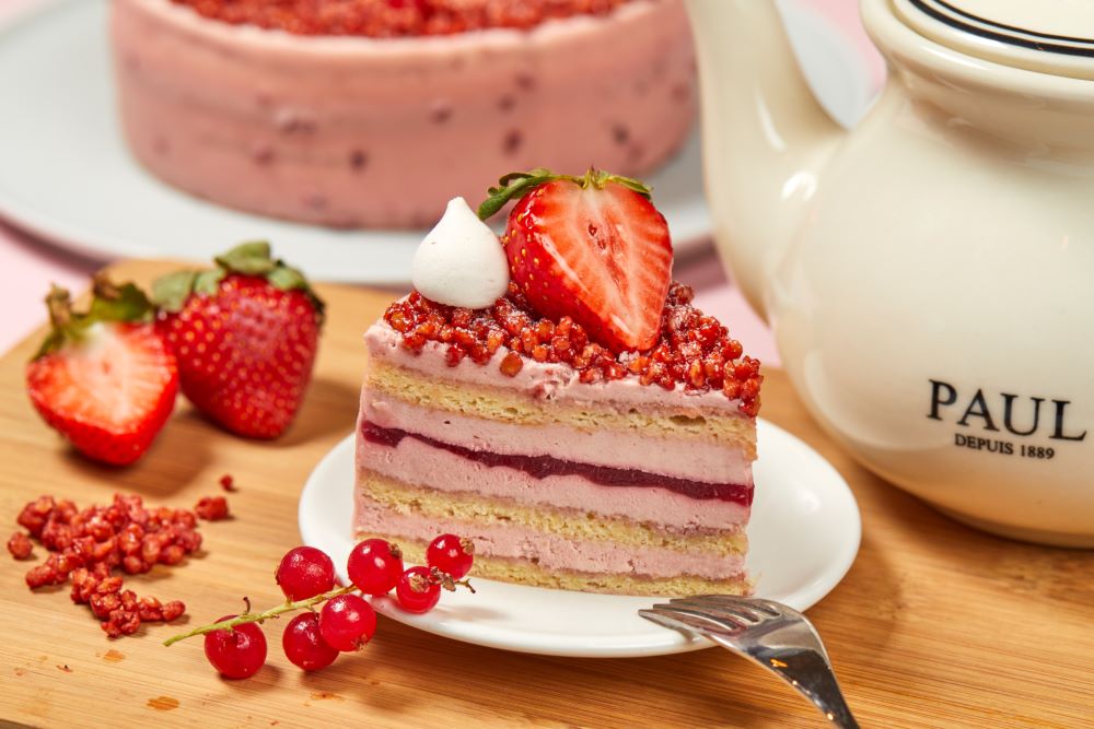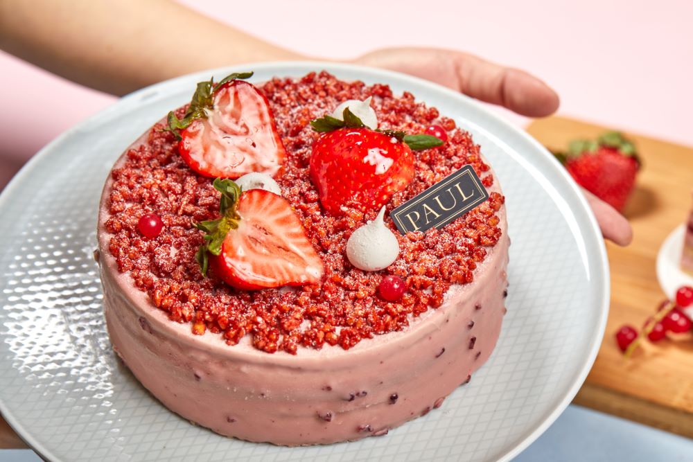 PAUL的「紅寶石天堂草莓蛋糕」,以刷上覆盆子白蘭地糖漿的鬆軟杏仁蛋糕,擠上草莓覆盆子奶油霜,夾入酸甜的覆盆子荔枝凝凍,層層堆疊。外層沾取紅寶石巧克力再鋪上滿滿的杏仁脆粒,入口除了有莓果的微酸、奶油的香甜,還能咬上脆脆的顆粒,如靈魂伴侶般契合的口感令人驚艷!