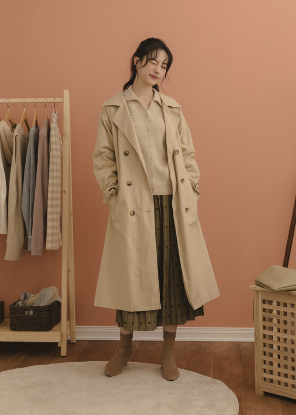 甜美日系風格的女孩可以選擇風衣下擺呈傘狀的設計,視覺上可以讓下半身更顯瘦,琥珀色釦子讓整件外套看起來不會太過於無聊,搭配百褶裙營造層次感,這個穿搭小技巧一定要學起來~