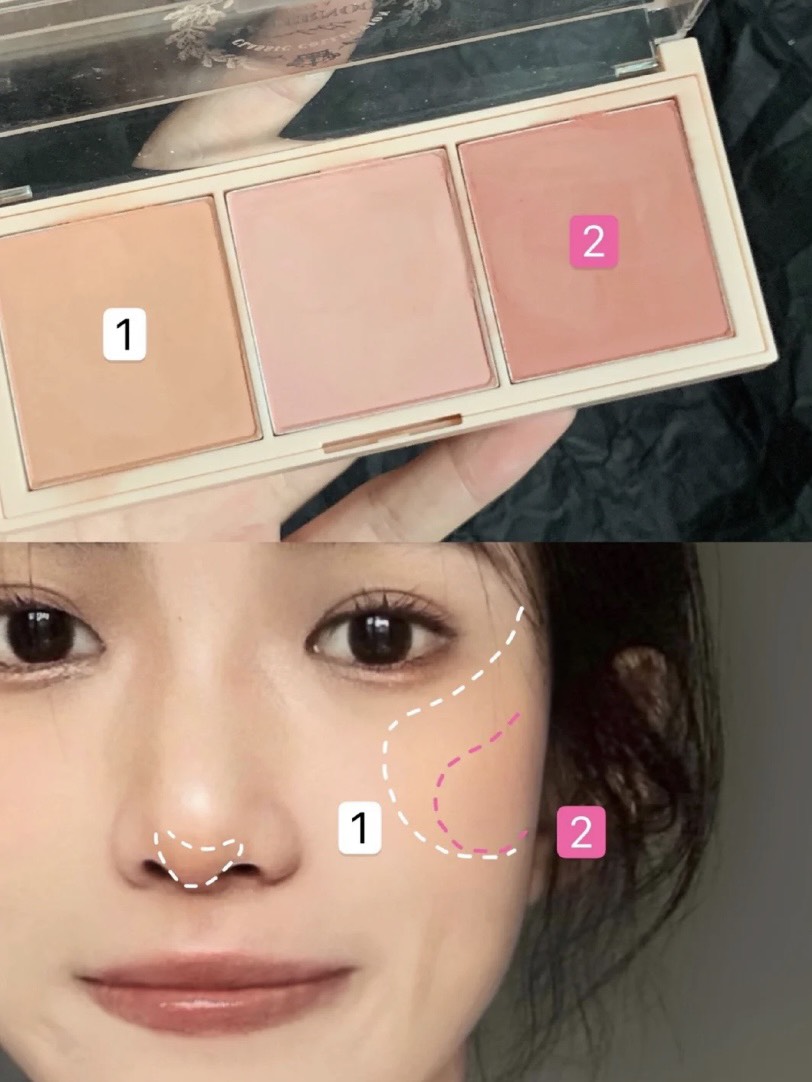 選擇淺橘色以及淺粉色腮紅搭配,利用顏色深淺由內而外疊擦,畫一個修飾臉型的腮紅,可愛度滿分!
