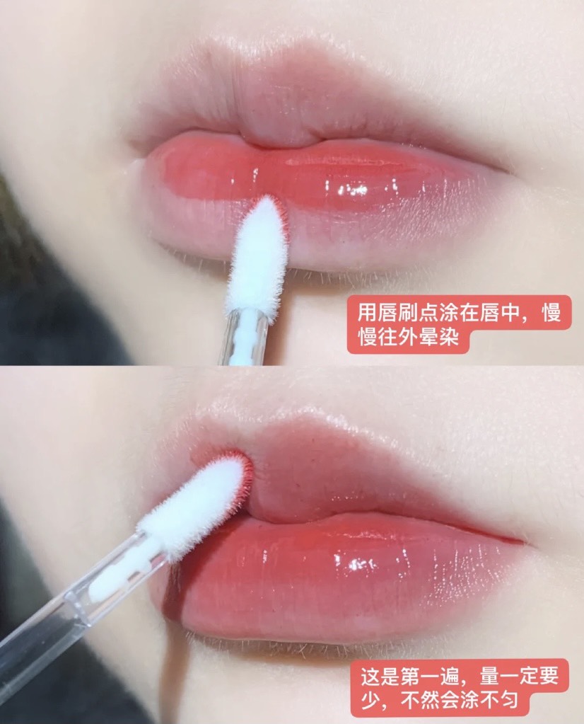 而塗唇釉也是有技巧的,先沾取少許唇釉點在下唇中央,慢慢往外暈染開,接著用剩餘的唇釉畫上唇的部分,若想要顏色更飽和可以再上第二、三層!