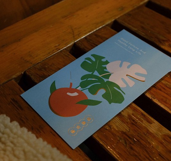 新年少不了的水果、植物吉祥話系列,也能化身成紅包設計的一部份!撞色的設計象徵著新潮的思想,也期盼著新的一年能夠過的越來越精彩!龜背葉與蘋果象徵長壽平安,適合帶著尊敬祝福的意義送給家人~