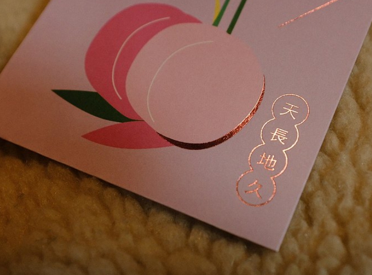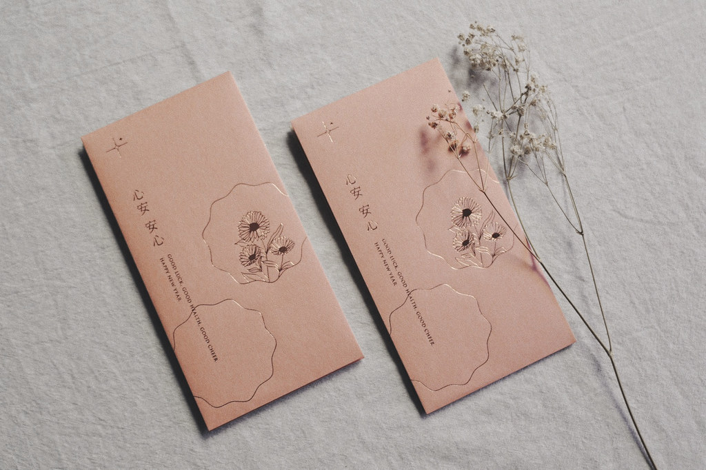 這款「心安安心紅包」選用了日本竹尾里紙, 在觸感上有別於一般的紅包,而粉杏色的顏色更是讓人看了就馬上擁有好心情!精緻的圖案燙工近看也沒有破綻,是一款質感、價格都在線的紅包設計~