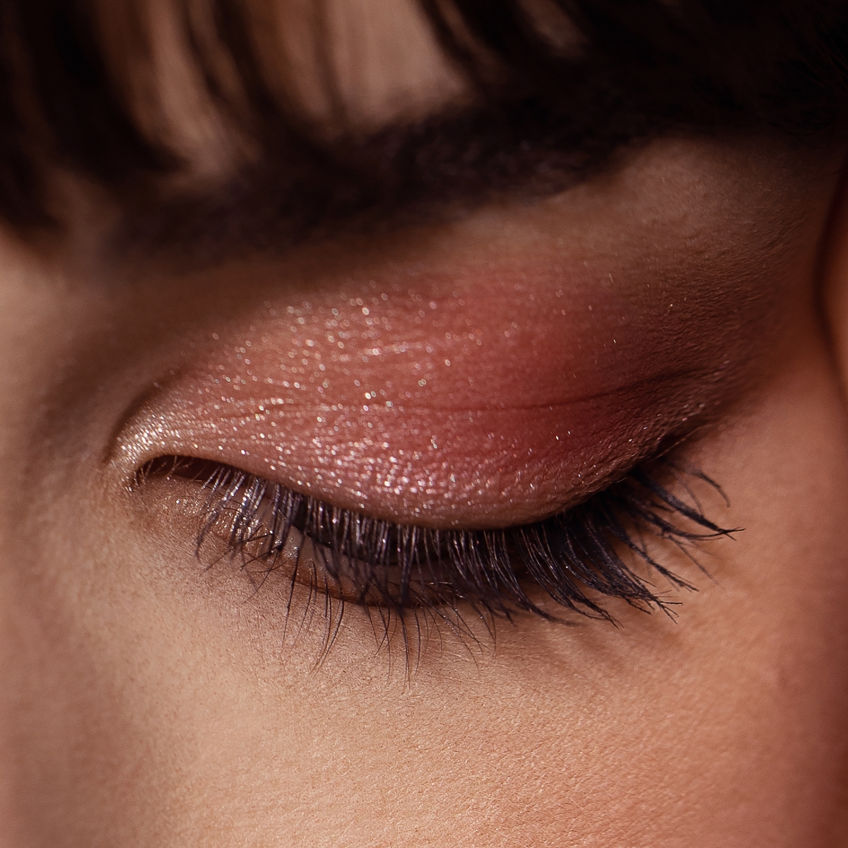 將淺粉紅色輕刷於眼皮上,打造出好感度絕佳的妝容,在使用香檳金色畫在顴骨、眉骨部位,強調出五官的立體線條。