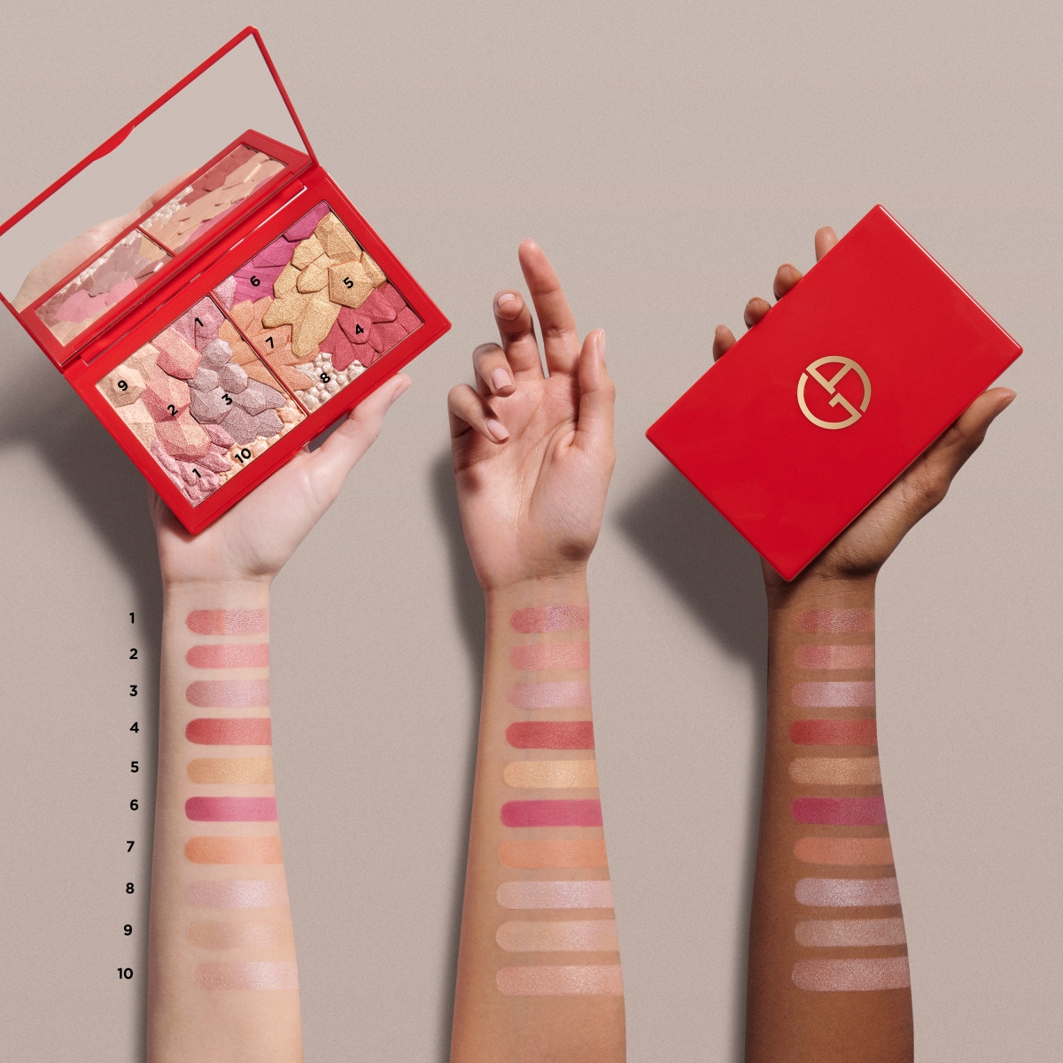 近年由時尚版圖擴展至高訂珠寶界的亞曼尼先生,以個人收藏的珠寶為靈感,一手打造了【亞曼尼高訂珠寶晶鑚彩盤】,打開後映入眼簾的絕美珠寶切割設計一眼就令人戀愛,包含可用來打亮的月光香檳色、珠光淺粉色與玫瑰粉紅色當作腮紅或眼影都適合,而較深的棕紅色澤可以用在修容製造陰影,10個色彩可單色使用也可以混色堆疊暈染,細緻的粉質用不論是用手沾或是化妝刷沾取都能輕鬆顯色,閃耀的珠光更能為妝感點綴出奢華氣息,能夠提升妝容質感,將光線折射打造出五官立體感,直接躍升高級臉!