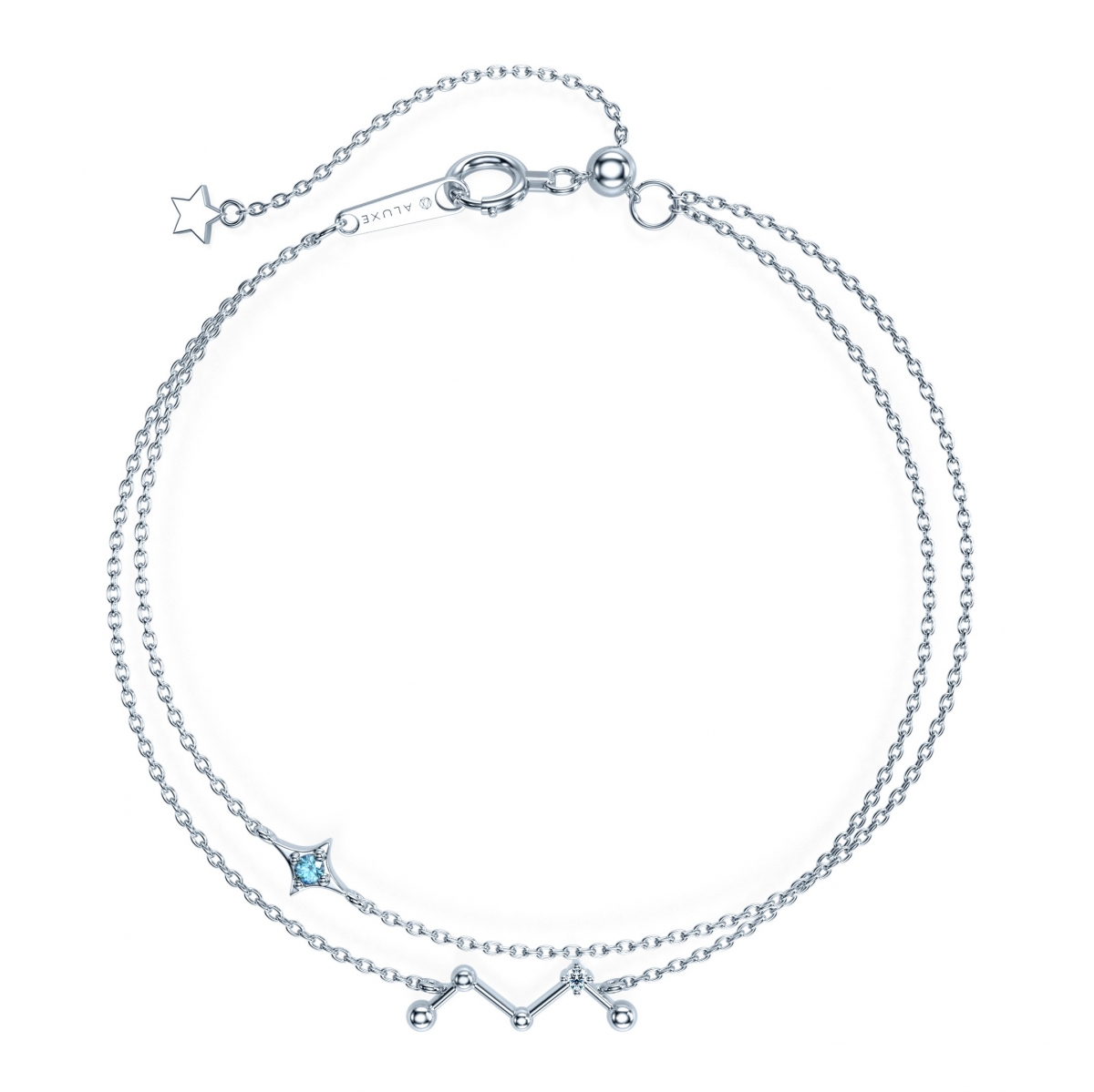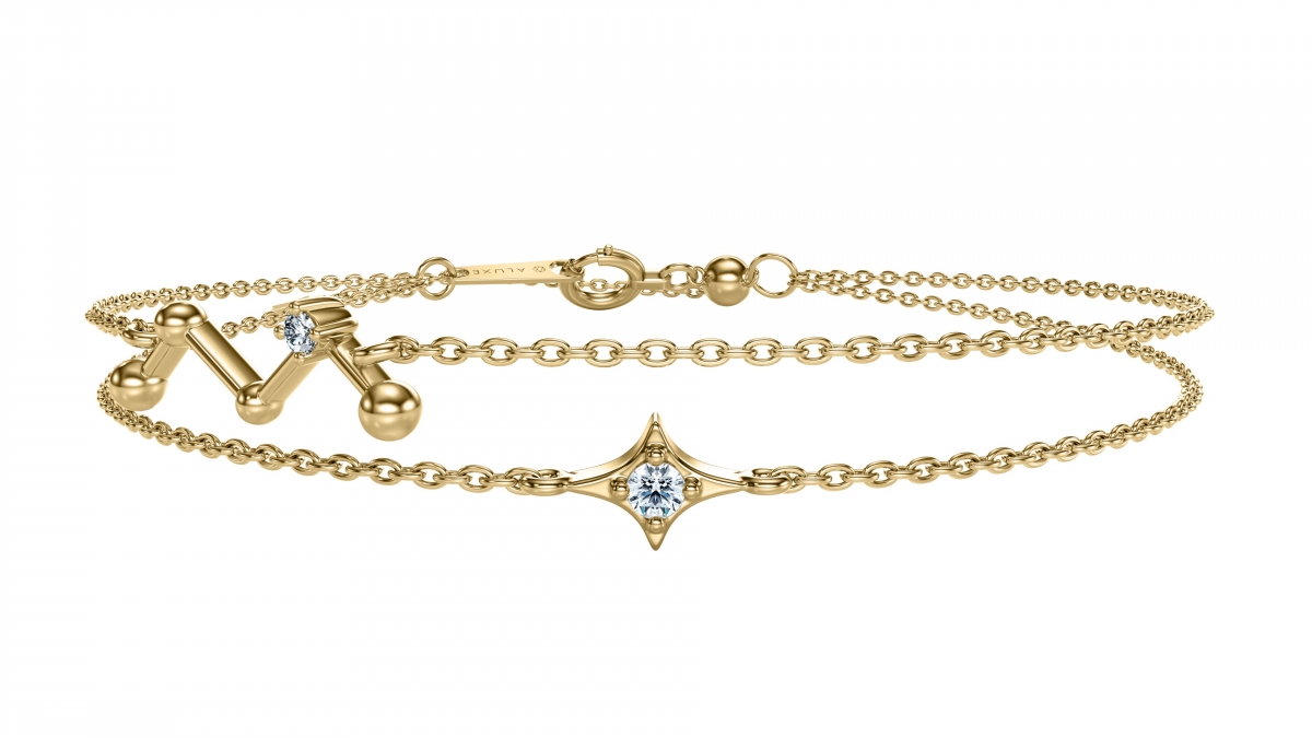 呼應Vivian徐若瑄單曲『數星星的你』,以星星和星座做設計發想,象徵兩人互相指引、照亮就像永恆的星星般,在彼此的生命中交疊閃耀。手鍊採雙鍊設計,用寶石象徵永恆閃耀的星星與連成M型樣式的星座交錯,再用鑽石點綴,綻放夜空中的耀眼光芒。白K金款式以Vivian徐若瑄三月誕生寶石『海藍寶』傳達勇氣、愛與和平的信念;黃K金款式以鑽石點綴,除了配色更加活潑立體,鑽石也述說了永恆的信念與堅定。手鍊尾端以星星做設計,呼應整個主題,舉手投足間更展現可愛的小巧思,為時尚優雅注入活潑氣息。