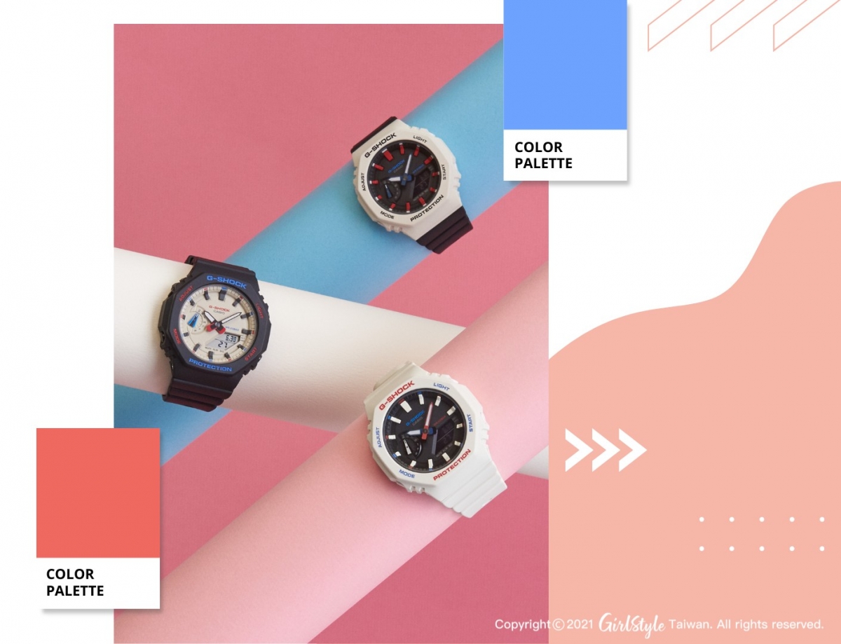 除了利用運動鞋快速表現運動感之外,選擇寬鬆的大學T也可以打造俏皮的運動造型~同時展現隨性自在的生活態度,點綴GMA-S2100WT系列撞色美錶,以獨樹一格的三色設計,加上錶盤的藍紅配色,凸顯出黑白主色,使其在任何角度都亮眼奪目,從細節讓整體更活潑,豐富的色彩讓妳走在街上都令人不禁想多看兩眼呢!