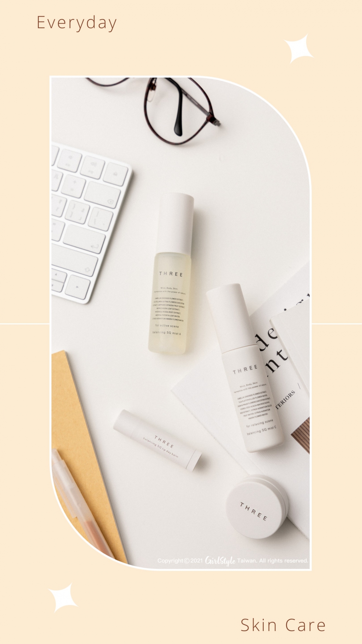現實社會中太多不穩定,不管是社會、生活,還是天氣,如果不希望肌膚也因為各種狀況而不穩定的話,就取決於日常保養的細節,除了改善飲食及運動習慣,調整晝夜節律更是基本且重要的保養工作之一,跟上THREE順暢切換一天的模式,輕鬆維持身心肌平衡的狀態吧!