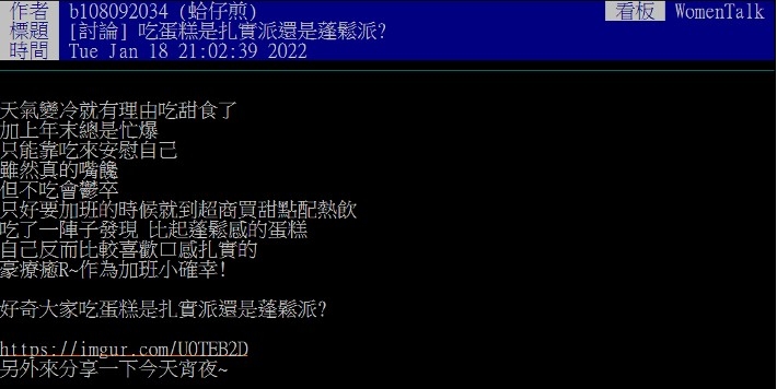 這款磅蛋糕更在討論區上意外掀起熱烈討論,以「吃蛋糕到底是扎實還是蓬鬆派?」,引起兩方死忠粉絲現身說法,而兩派的人數不分軒輊,紛紛在討論串上為自己喜愛的派別贊聲!