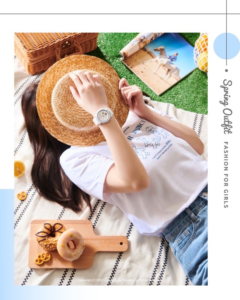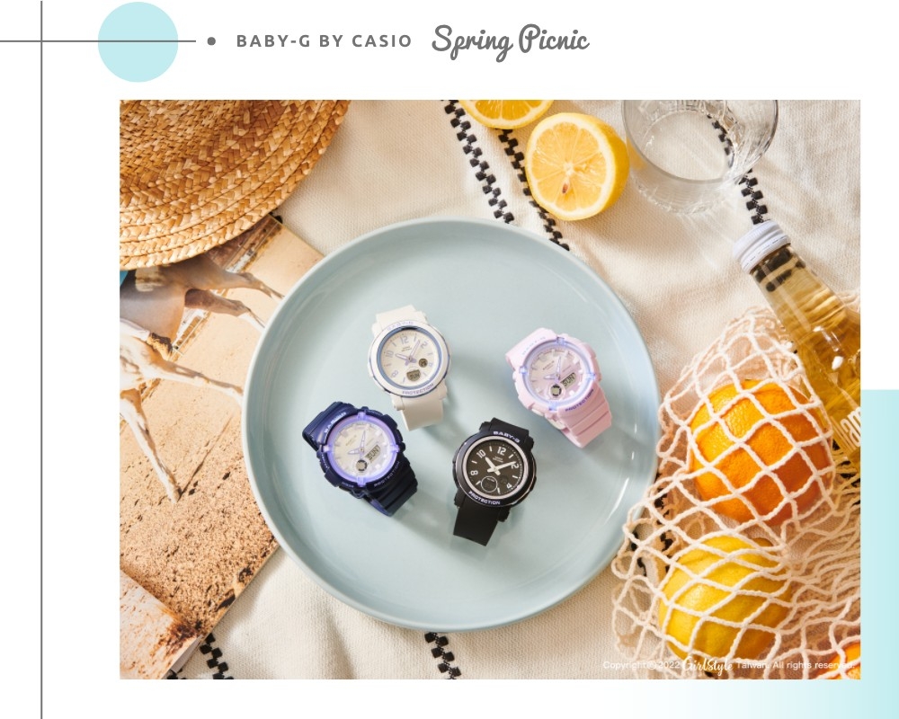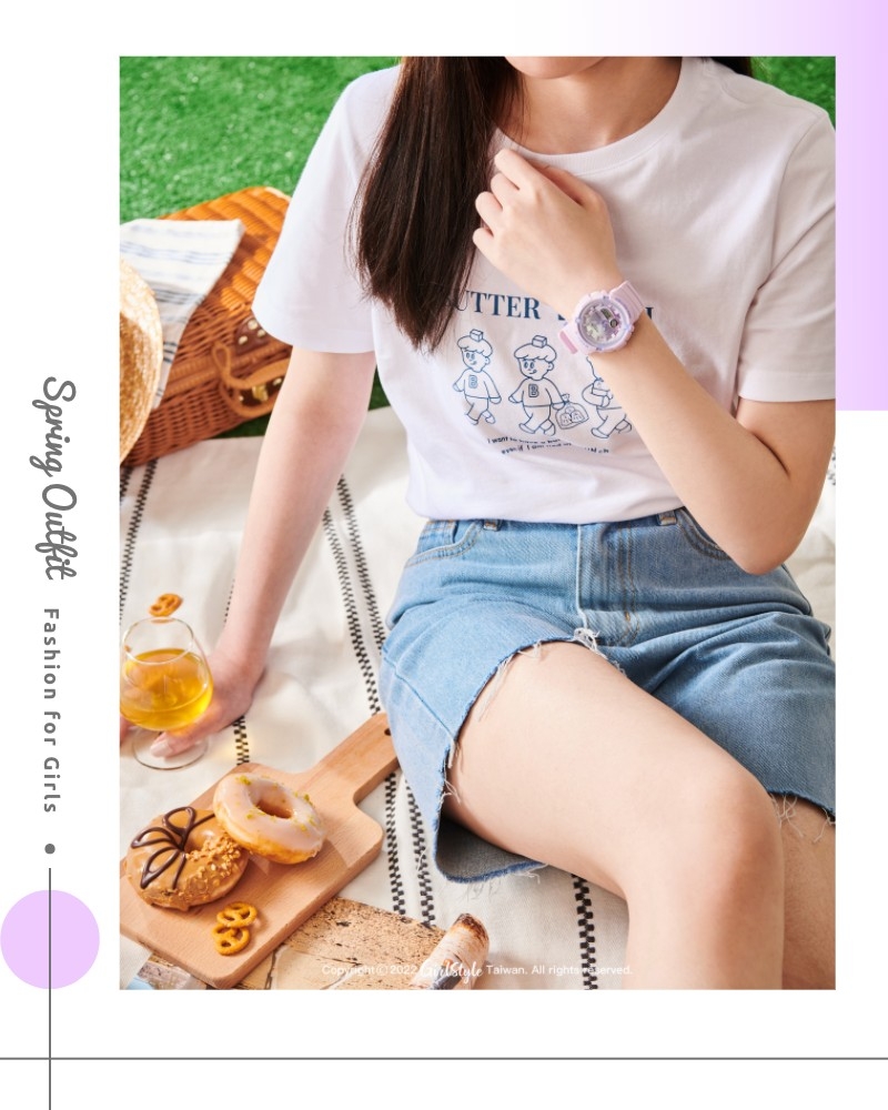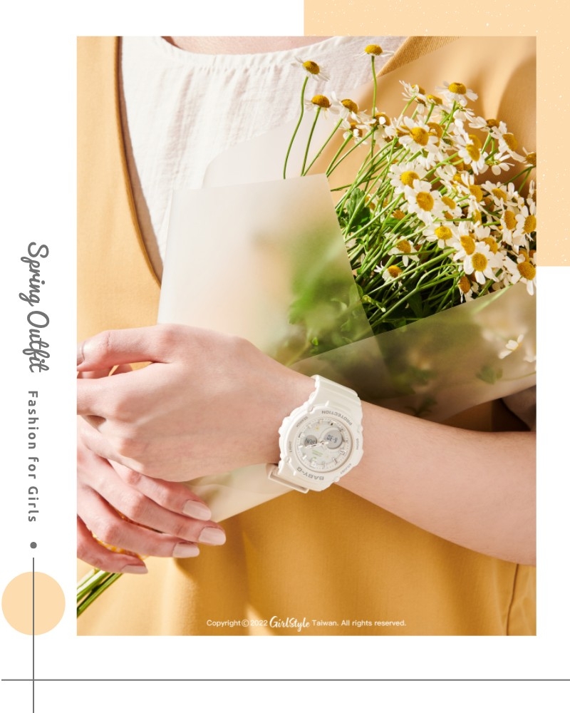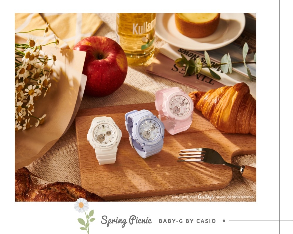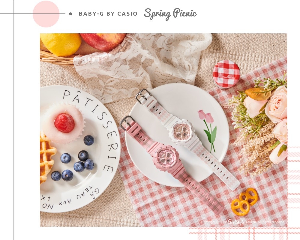 誰不想當個春天的小仙女呢~學會美美的野餐穿搭技巧,再配戴一只BABY-G仙氣美錶,除了為整體造型加分添彩,還具備耐衝擊構造及防水100米設計,讓妳今年春夏想跑山跑水都沒問題,每分每秒人見人愛、花見花開 (笑)