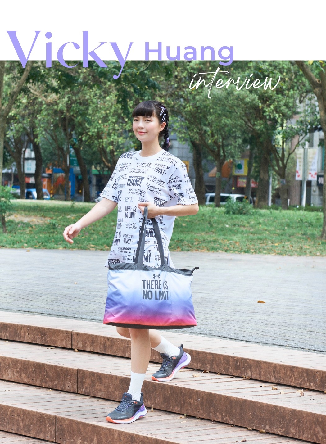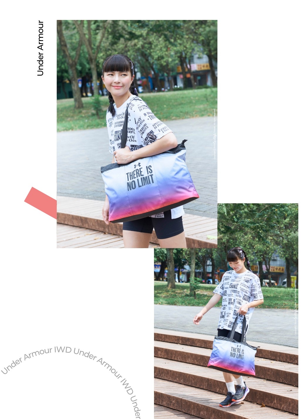 不是天生條件好的她,其實也經常質疑自己,她告訴我:「雖然說有人會罵你,但我收到了更多更多的鼓勵,不是全世界的人都是完美的,而我的不完美可以讓大家更勇敢、更有勇氣。」就像她身穿Under Armour ’There is no limit系列’ 的黑白T-shirt,透過滿版的能量標語,向大家傳遞滿滿的正能量,做一個無所畏懼的自己!寬鬆版型也是運動初學者的必備單品,內搭長度適中的Meridian短褲,輕鬆拉長身材比例,再揹上同系列漸層側背包,整體時髦又有個性!
