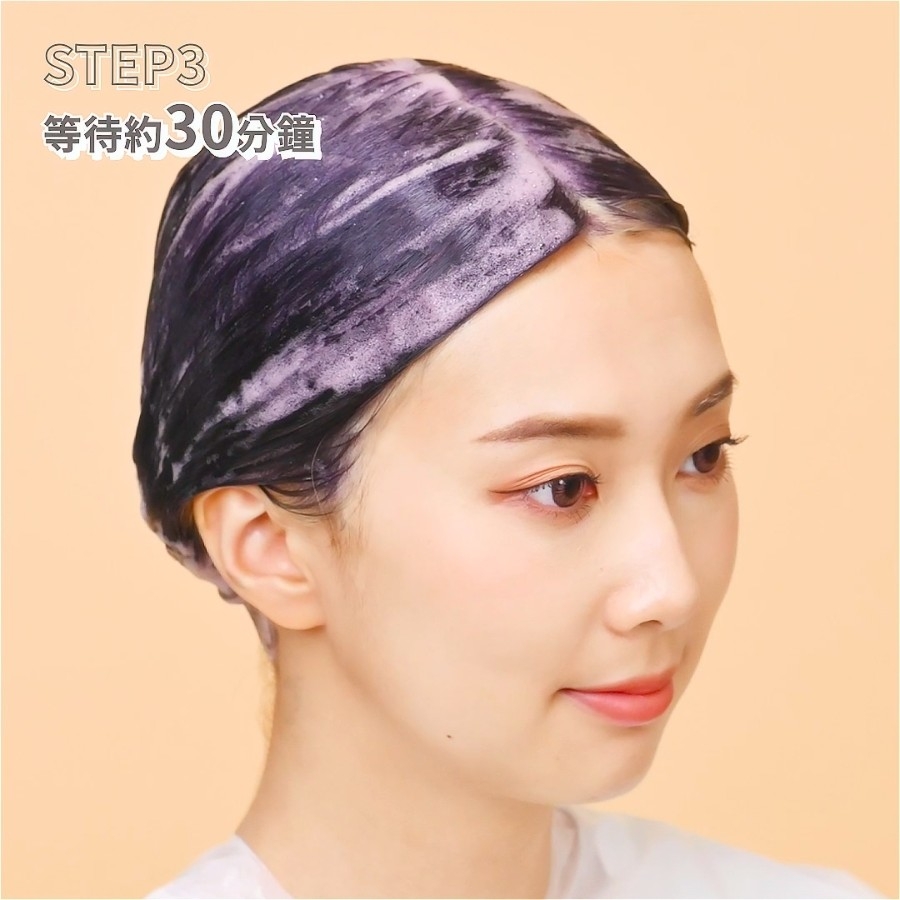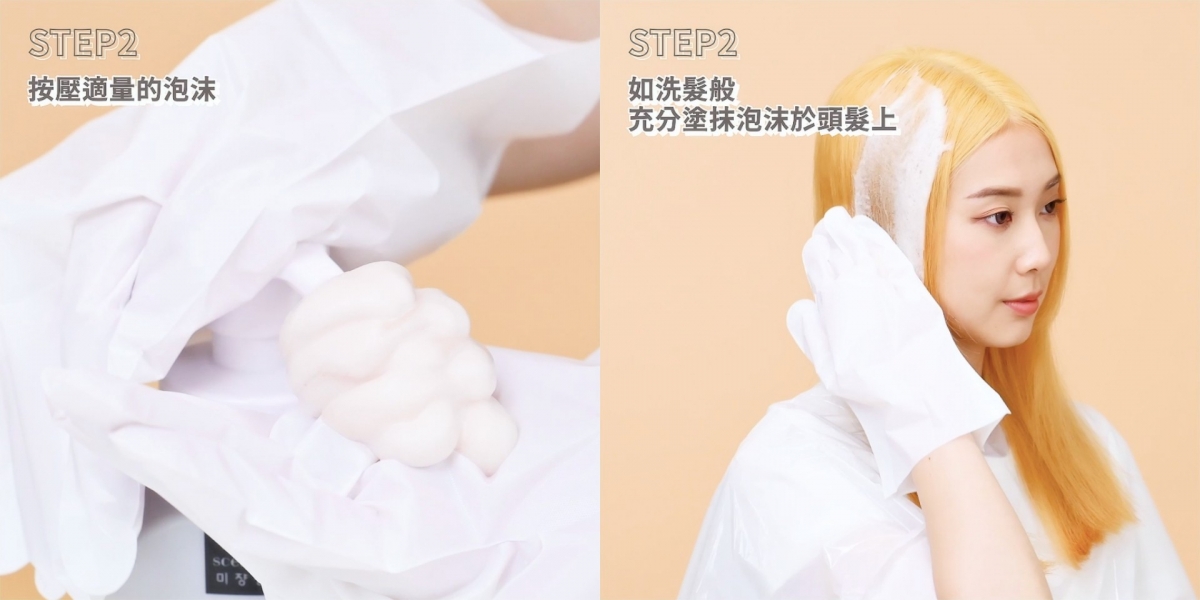 接著,就可以進入最輕鬆的第二步驟染髮了!只要按壓出適量的豐盈泡沫,一次約3-4下,如洗頭髮般,從頭皮處由上而下均勻塗抹,直到泡沫完全覆蓋髮根及後面的頭髮。