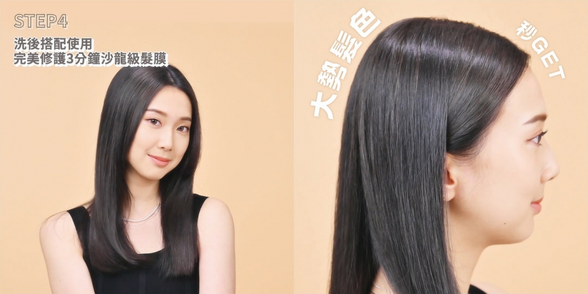 最後一個步驟,以清水將頭髮徹底沖淨,並搭配內附的魅尚萱完美修護3分鐘沙龍級髮膜,可以在短時間內集中修護,讓秀髮吸收滿滿養分!小編貼心提醒,塗抹時記得避開頭皮喔!