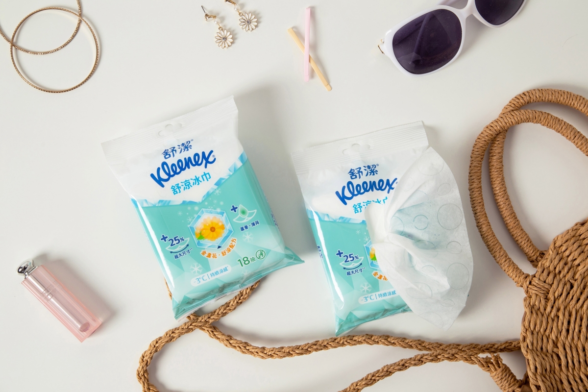 舒潔品牌表示,市場資料顯示,市售涼感濕巾大多強調勁涼與酷涼功效,對多數女性消費者而言,普遍認為太過刺激!一向從消費者需求出發、不斷推陳出新的舒潔品牌,看準多數民眾需求,特別推出「舒潔舒涼冰巾」新品,除了保留產品涼感功效:降低體感溫度3℃並持續散發沁涼舒爽感受外,更打造市場獨有的產品特色:添加金盞花及蘆薈萃取,有效舒緩肌膚悶熱;在產品質地上,採用專利天然紙漿布,提供比一般材質濕巾更柔軟親膚的觸感;最加分的是大尺寸設計,大大滿足消費者希望一張就能擦淨臉、手、頸、身的需求!此外舒潔舒涼冰巾採用花香調,味道淡雅清新,降低大眾普遍對於市售涼感濕巾酒精味濃厚、味道刺鼻的疑慮!
