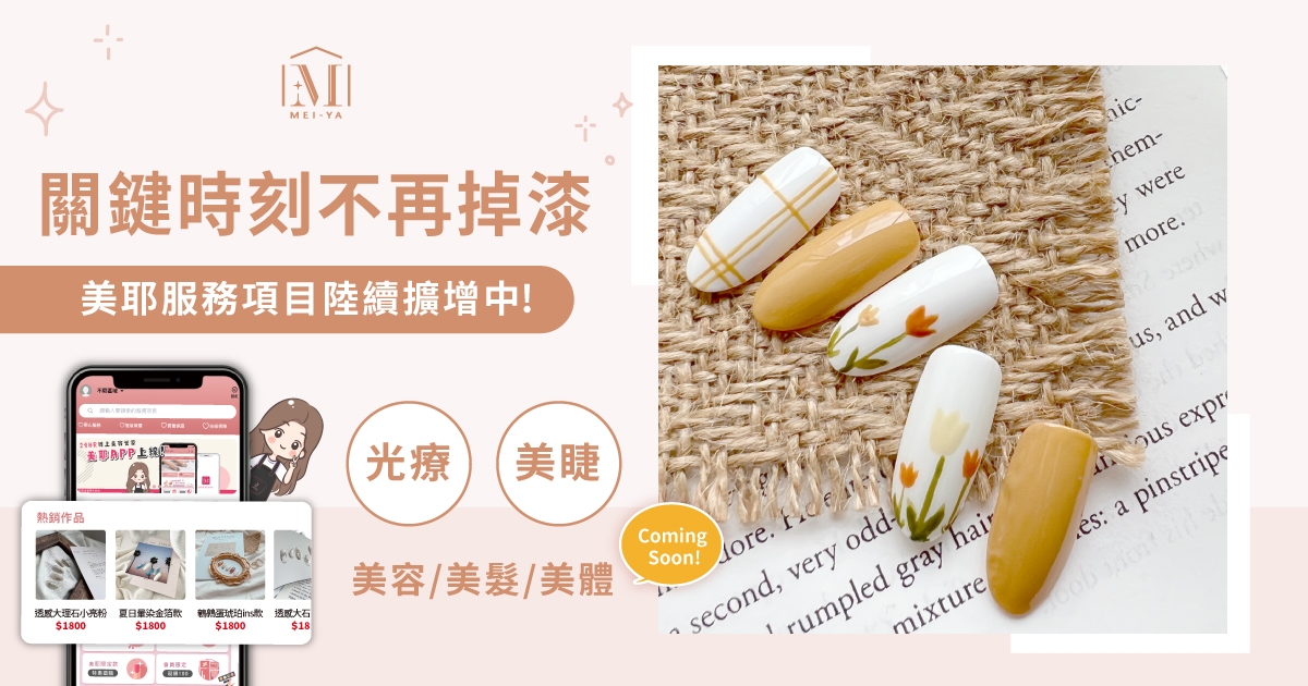 整天滑IG、小紅書被ins爆款美甲輪流放火燒,想搶美甲師釋出的時段卻比每學期開放搶課還難!和三五閨蜜們臨時約好週末熱門咖啡廳拍美照、好不容易排開時間決定和男友來場小旅行,沒有修剪的粗糙甘皮、來不及更換過長的光療美甲、不聽話的分岔睫毛,忍不住在意這些不夠完美的小細節,光想到就超級阿雜~關鍵時刻不想再掉漆嗎?別怕別怕,就讓小編來推薦一款神級應用程式,堪稱2、30代女孩的新世代寶藏級APP-美耶,幫大家解決所有跟美有關的問題!