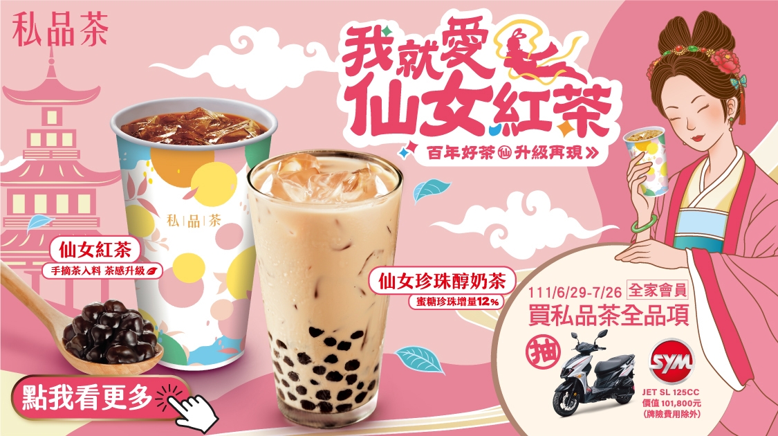 小編這邊也要偷偷告訴各位好康,在6/29-7/12還能享有會員嚐鮮價,6/29-7/26更有仙女下凡加碼活動!只要是全家會員購買私品茶全品項系列產品,就有機會抽中「機車大獎SYM JET SL 125CC 乙台(兩名)」!各位仙女們快一起喝起來吧~~