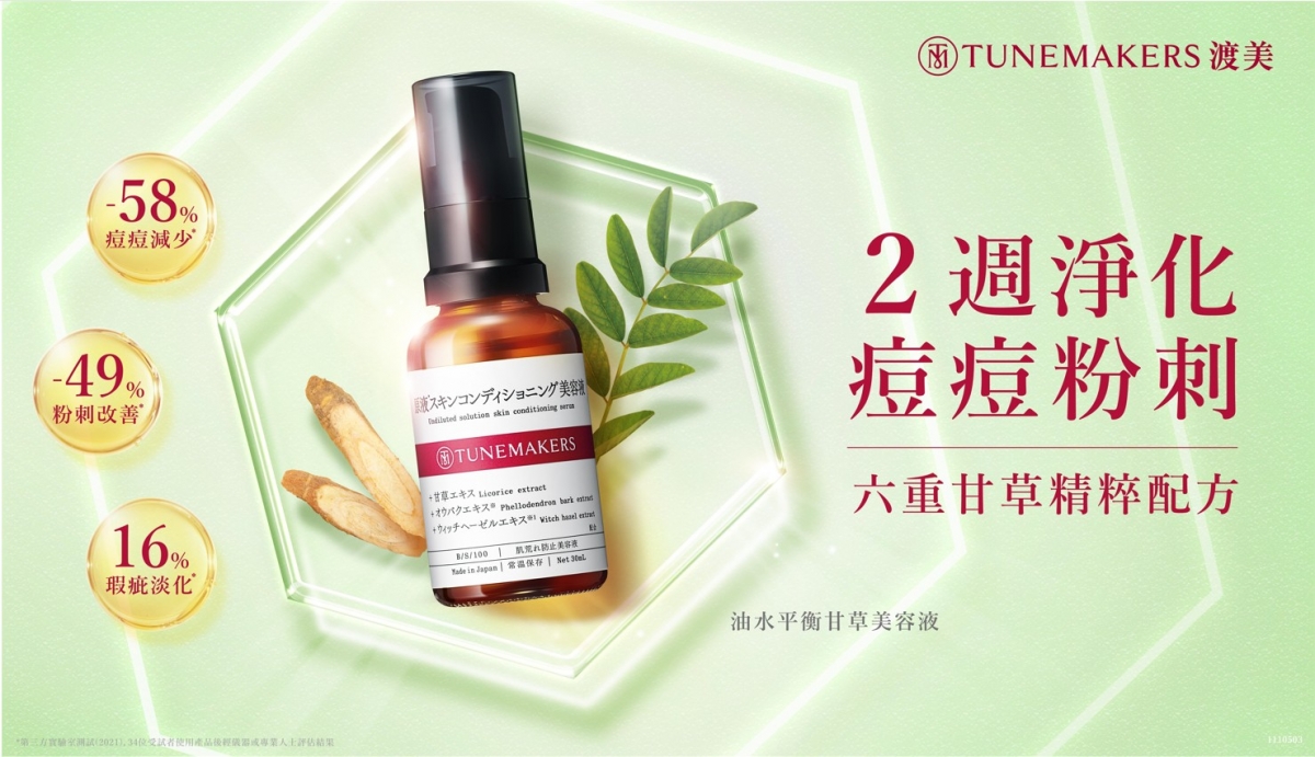 除了推出全面打擊痘痘粉刺的全新甘草制痘解方「油水平衡甘草美容液」,TUNEMAKERS渡美也同時針對重度油痘肌、黑頭毛孔問題及混合肌膚者推出兩款原液神隊友,將甘草草本抗油制痘系列產品線補齊: