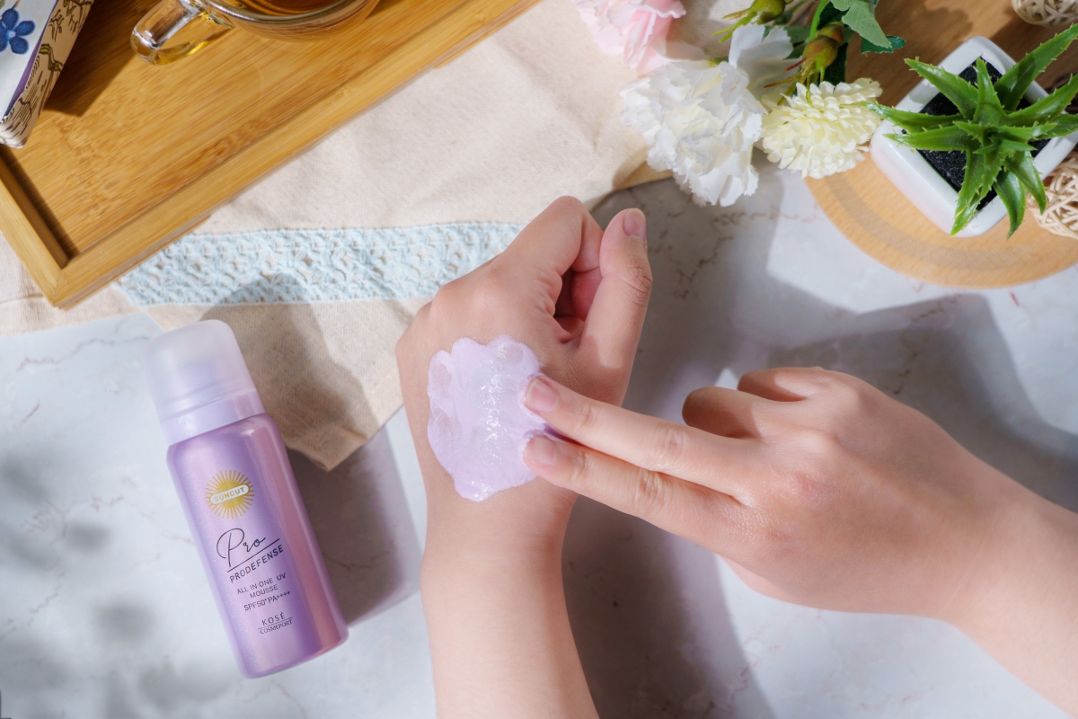SUNCUT UV 曬可皙新推出的超強新品來了!繼今年三月推出極度防禦高階防曬系列,極度防禦美白防曬精華與極度防禦溫和防曬乳,七月再新上市「極度防禦全效微米防曬慕絲」可不簡單,除了是無重力的超療癒泡泡慕絲質地,其中還有防曬、潤色、美容液、粧前隔離、隔離外在環境傷害的五合一功效!薰衣草色潤色慕絲,能夠有效修飾蠟黃,此外還添加了「持粧UP成分」,可以預防脫粧,而且不易沾染於口罩,另外還含有高達64%的美容液成分,美肌輔助修護CPX,添加玻尿酸鈉‧可溶性膠原蛋白‧角鯊烷(保濕)等,以及修護UV傷害CPX ,添加3種柑橘果實淬取液‧迷迭香葉淬取液‧富有多酚之茶葉淬取液SL(保濕)等,潤色防曬同時也能兼具肌膚保養,增加肌膚透亮感,實現偽素顏美肌,快速出門強效防水爆汗也不用擔心,亦不沾染口罩,一整天都保持完美!