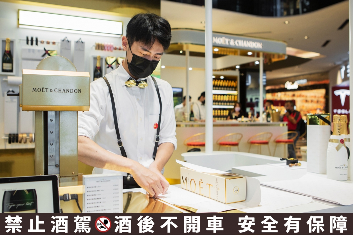 針對購買750ml香檳禮盒消費者,店內同步提供瓶身印字及禮品包裝服務,來自法國酩悅香檳總部的禮品包裝藝術,金色鏡面包裝紙搭配酩悅香檳品牌標誌壓紋,經典黑色鍛帶及紅色封蠟,展現酩悅香檳與送禮結合的極致奢華感。而購買酩悅香檳2013年份粉紅香檳除印字及包裝服務外,更可享有紅色封蠟服務,蠟封印章是早期貴族與王室使用於重要信件書寫。酩悅香檳沿襲法國傳統,將紅色樹脂塊於蠟燭燭火下逐漸融化,再以鋼質印章,壓印出獨屬於皇室香檳的皇冠標章,展現工藝的精雕細琢及時間淬練下的獨特與珍貴,創造令人怦然心動的贈禮體驗。