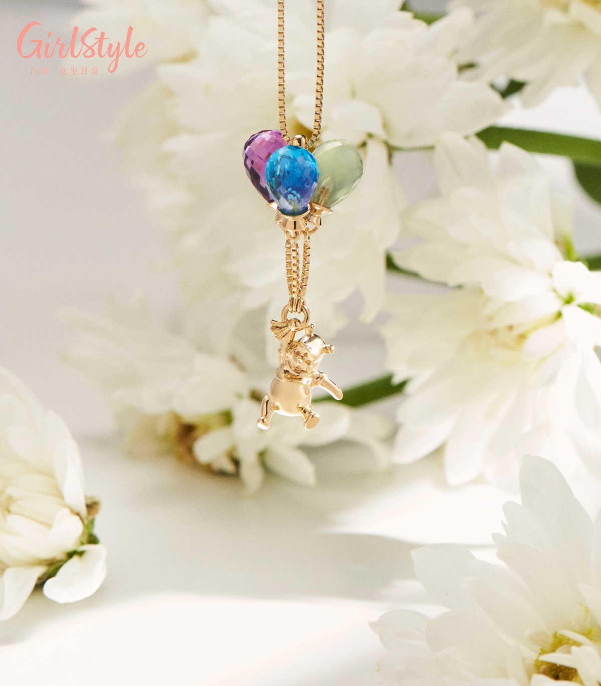 童心大起的維尼抓著氣球飛在空中啦~滿天星車工的彩色寶石作為希望氣球,配戴在脖子上時的輕輕搖曳,讓氣球寶石更加栩栩如生!而與氣球相繫的「小熊維尼」彷彿充滿期待等等的飛天旅行,細緻的雕刻讓維尼愉悅的表露無遺,貪玩的臉頰藏不住心中的雀躍!讓配戴的妳心情也跟著UP起來~