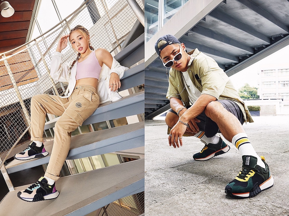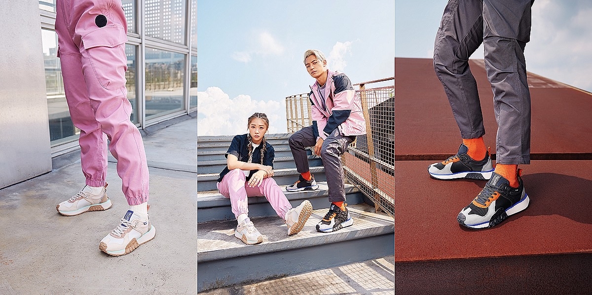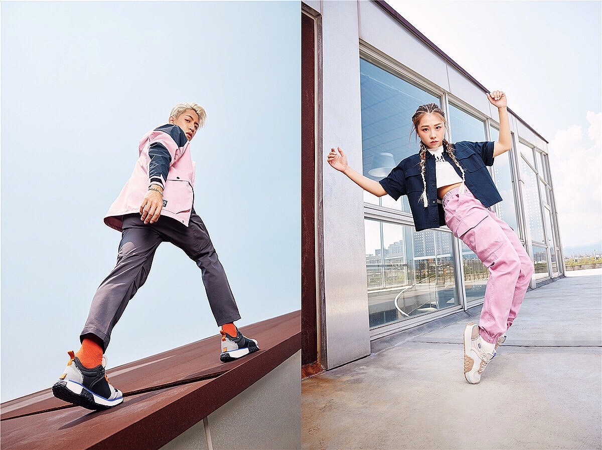 艾薇「柔霧粉」X吳霏「城市灰橘」是不是情侶完美搭配!讓小編的少女心都噴發出來了~兩人都以潮流工裝穿搭的風格為主,並用粉、黑配色作為情侶的穿搭色系,與腳上的「TROOP RUNNER軍種潮鞋」配色完全契合!艾薇身著亮眼的粉色長褲,搭配「柔霧粉」巧妙的讓整體風格不過於硬派反而有種酷甜風的感覺~而吳霏則將亮眼色分在上半身以及鞋子身上,粉色外套加上「城市灰橘」中螢光橘搶眼的點綴,使整體穿搭更平衡,堪稱男生亮眼色系穿搭的教科書!
