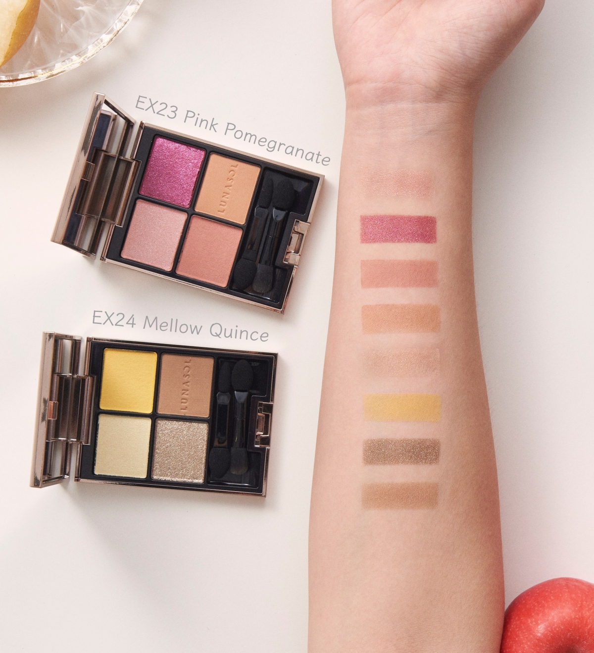 EX23 Pink Pomegranate的色彩魅惑到不行,帶有亮粉的亮色系能讓眼神像是帶著電流一樣四處放電;EX24 Mellow Quince乍看之下不是小編的日常用色,但是實際使用後卻意外超愛這一盤的配色,右上的黃色搭配左下的亮面棕色,交叉暈染下的顏色竟然變成最日常的迷人眼妝!最後再連點亮粉妝點,讓男生們眼睛離不開你٩(◦`꒳´◦)۶~