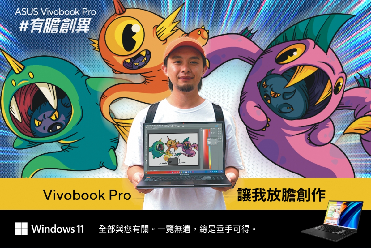 以攝影結合插畫,新銳創作者郭棋逸(71) 2020年被網路影片創作者「十六」發掘,同年創立71Picture,將色彩繽紛的可愛怪獸融入照片實景,幻化出一張張富含幽默童趣的作品。「71」從小在藝術氛圍環境下長大,爸爸是腳踏車零件設計師、媽媽興趣是國畫藝術、兩個姊姊也都是美術系畢業,畫畫對71來說像是與生俱來的能力。擁有無窮想像力的71,創建71Picture的初衷就是「想做跟別人不一樣的東西」,與ASUS Vivobook Pro「有膽創異」的精神不謀而合!ASUS Vivobook Pro 16X OLED採用微軟Windows 11 Home作業系統,助創作者發揮最佳生產力!透過桌面上Windows 11小工具,整合最愛應用程式和服務中的個人化內容,隨時掌握重要資訊。