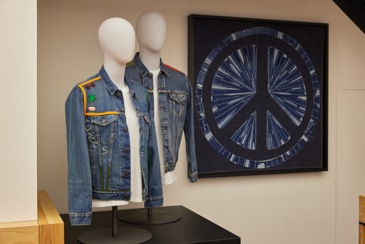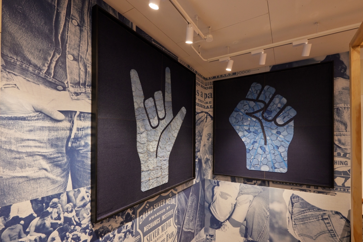 Levi’s®的丹寧面料具備經久耐磨的特性,長期以來為回收再利用的最佳面料,今年在Levi’s®未來丹寧旗艦店西門旗艦館中亦延續此一品牌特性,並邀請新銳藝術家彭柏碩一同合作,於摩登科技店裝中,加入手工再造的永續丹寧藝術品;彭柏碩將回收丹寧面料解構再重組,將或深或淺的湛藍丹寧和Levi’s®經典的標誌細節,運用幾何圖形及線條,一針一線地手工縫製、創造出獨到的視覺美感,其作品代表著Levi’s®與時下潮流趨勢與時俱進的精神,亦呼籲大眾永續環保是生活中不容忽視的一部份。