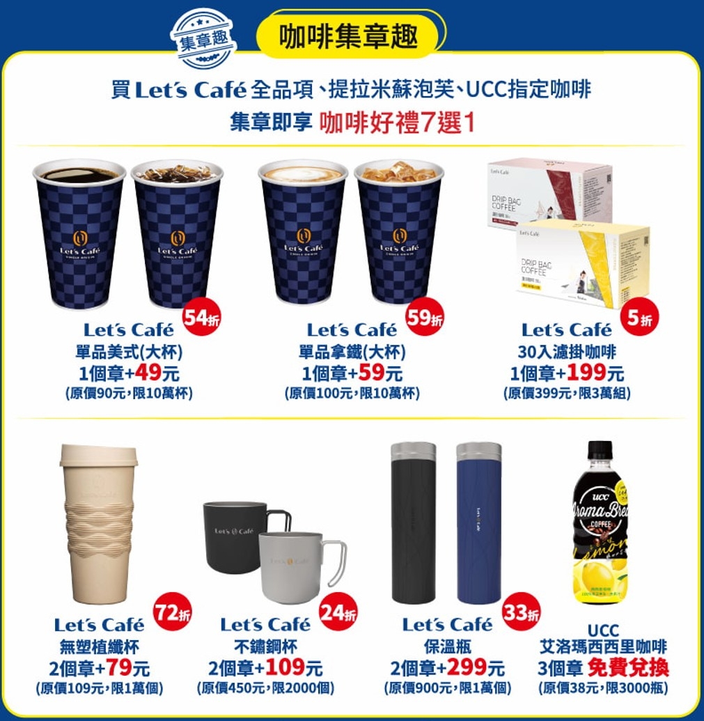 包括各10萬杯的大杯單品美式、大杯單品拿鐵,現在都只要一個章加上49元或59元就能輕鬆換取;又或集滿2個章的消費者,能以再加79元的價格兌換Let's Café 無塑植纖杯;還有原價450元的Let's Café 不鏽鋼杯,現在只要用兩個章再加109元就能擁有,等於以24折的優惠價格入手,相當划算。集滿三個章的消費者,更能免費兌換UCC艾洛瑪西西里咖啡。