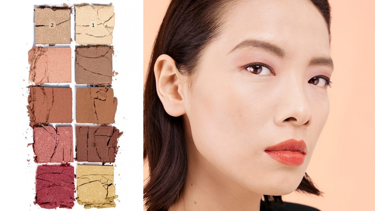 辦公室裡的經典質感妝容,只要運用眼影刷刷取彩盤中的1霧面奶油色大範圍的輕點於上眼皮作為打底,並以2帶著珠光的亮褐色提亮眼神,最後再以3的暖色紅棕上在眼窩增加眼神的深邃度。