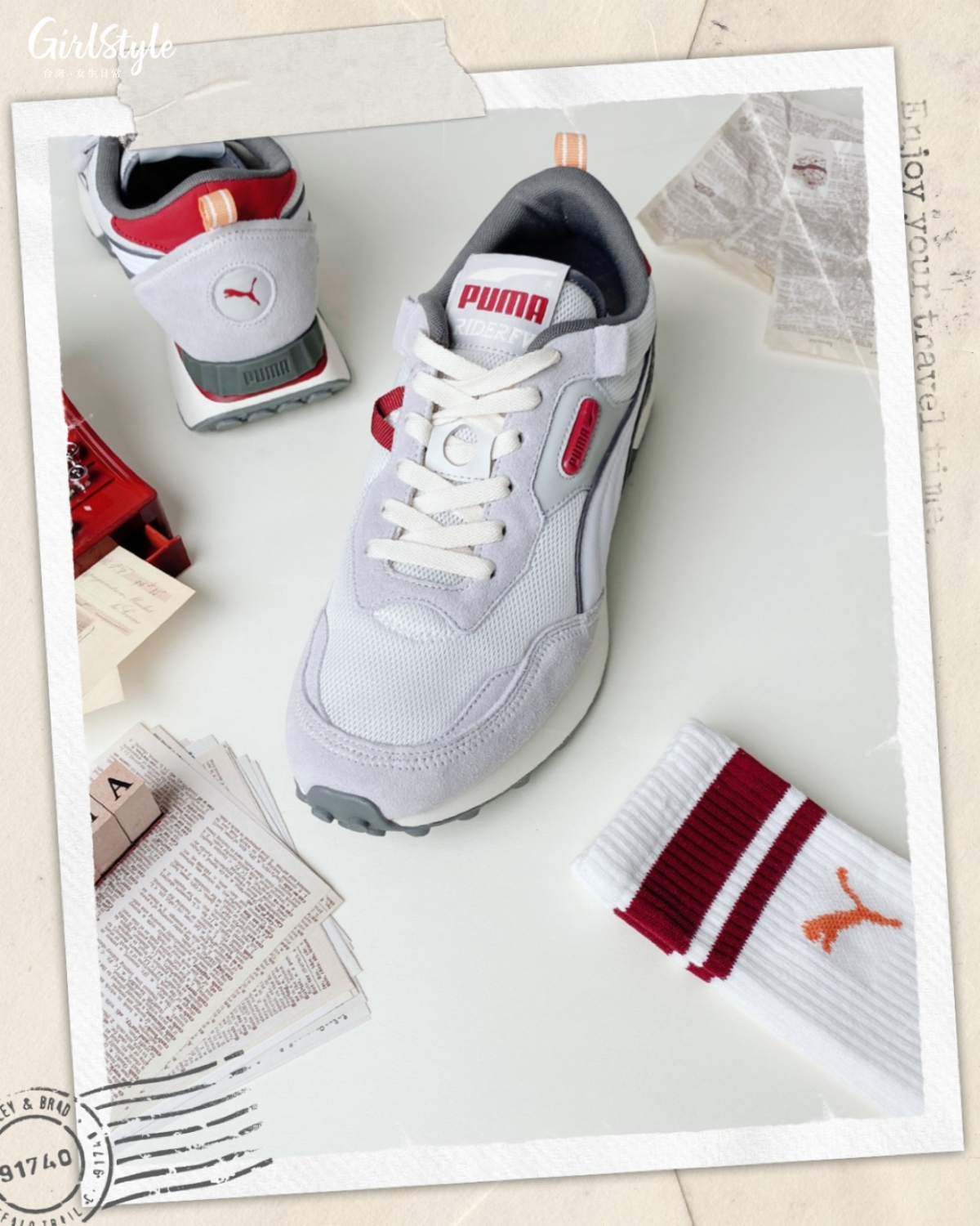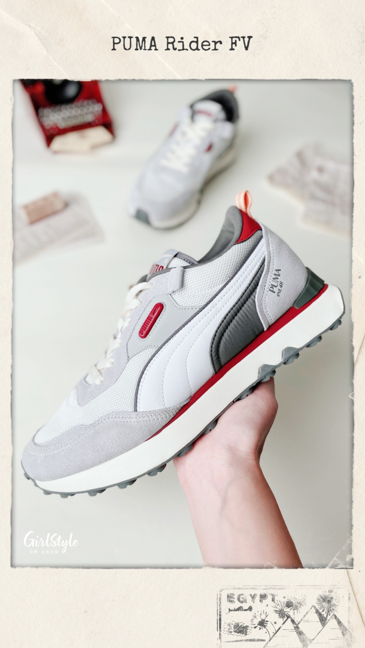上星期小編假日穿著新到手的PUMA Rider FV去逛街,直接實測續航力持不持久,整天下來真的有感覺腳沒有這麼痠!好啦~先別廢話,今天要分享的這雙常春藤酒紅又再次讓小編失心瘋!運用淺灰、深灰異材質拼接,讓整雙鞋看起來舒服又沈穩,再利用酒紅做線條的點綴讓整體更有層次!鞋後跟的稜角方邊讓視覺更衝擊、前衛,完美詮釋復古時尚!
