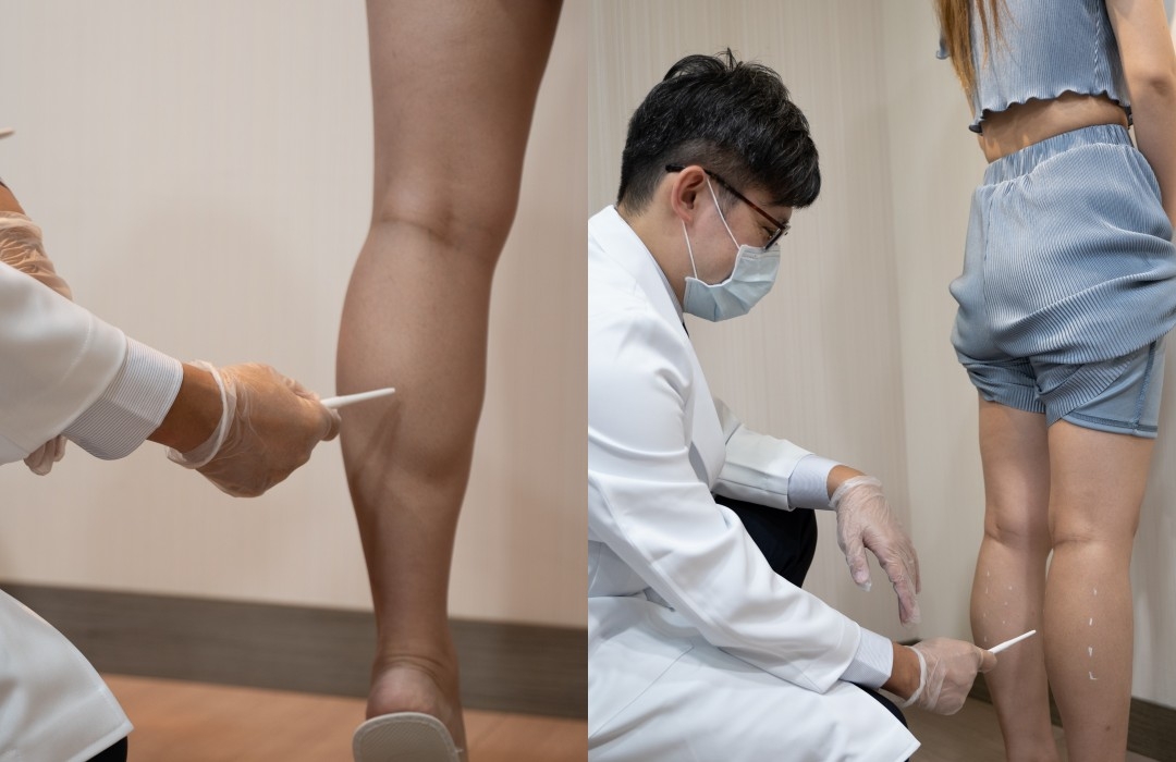 Caroline則是一直對自己的小腿肌感到困擾~所以這次許醫生也特別針對她的小腿肌做評估,透過和Caroline諮詢,醫生會先用筆在腿上做記號,然後一一解說為什麽這個點需要做施打,依每個人的肌肉結構不同,施打的劑量和部位也會有所不同。