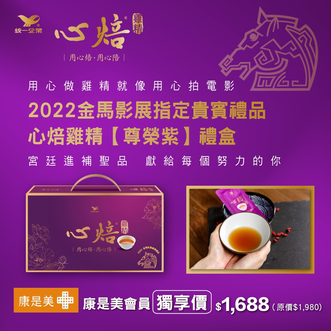 2022第59屆金馬獎完美落幕,堅持「用心焙,用心陪」做出好雞精的「心焙雞精」,對於禮盒包裝、製作工序、食材用料的堅持,如同用心拍出好作品的電影人。心焙以宮廷「尊榮紫」限定禮盒,致敬金馬59入圍者及貴賓。