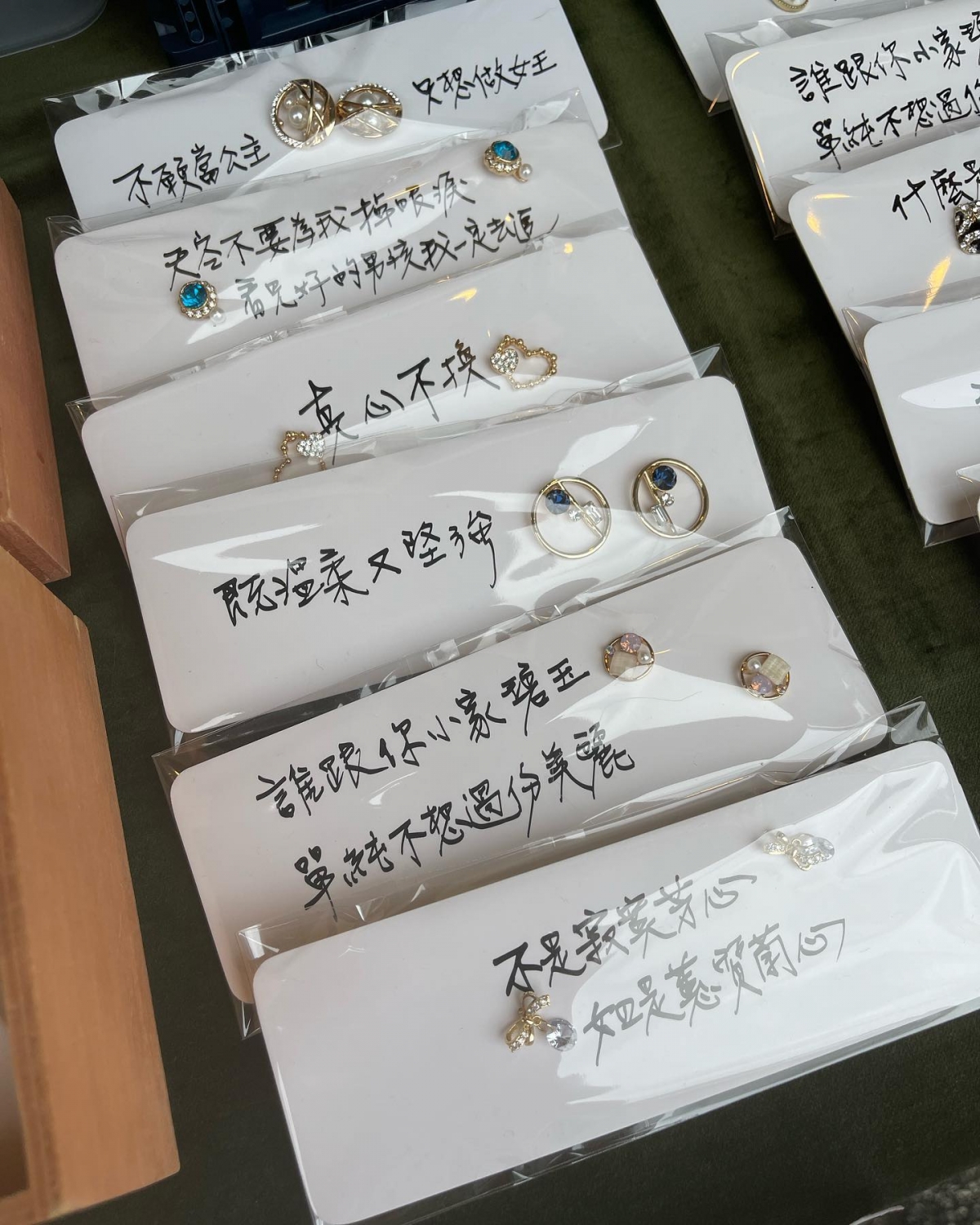 不同素材組成多彩繽紛的飾品,包含耳飾、髮飾、手鍊等等,不僅使用金工創作,也搭配琺瑯或者樹脂將顏色堆疊。創作重心為蝴蝶和花朵,讓小姐姐們能夠透過眼睛就感受到香氣的濃郁。設計著隨著溫度變化就能改變色彩的飾品,成為喜愛與眾不同的朋友第一選擇。