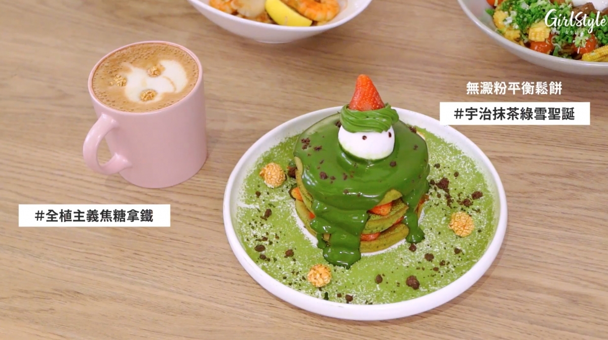 為低碳水飲食潮流打造的無澱粉鬆餅,成份包括亞麻仁籽等堅果。以抹茶鮮奶油、抹茶黑糖淋醬、京都抹茶粉呈現日式和風,跟新鮮草莓堆疊起來就像一棵鬆餅版本的聖誕樹。使用甜度較低的海藻糖,適合想要享受甜點又無負擔的人。