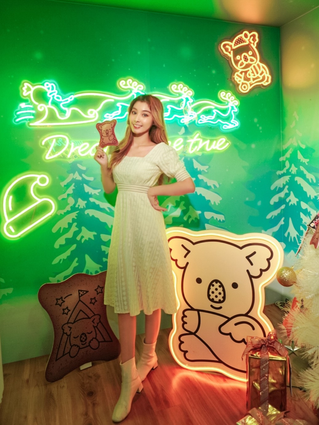 樂天小熊聖誕屋除了正中間的夢幻水晶球之外,旁邊的霓虹燈也絕對不能錯過!右邊寫著經典的祝賀台詞Merry Christmas,左邊則是馴鹿拉著聖誕老公公並寫下Dream Come True!完全不用擔心霓虹會不會反光,聖誕小屋裡的燈絕對能照出妳的美,不讓頂光讓照片見光死!而聖誕賀卡連字都不用寫,後面的霓虹燈是直接寫下聖誕祝福語,這次賀卡不用再花心思做,直接拍完就可以Send給妳心愛之人啦~