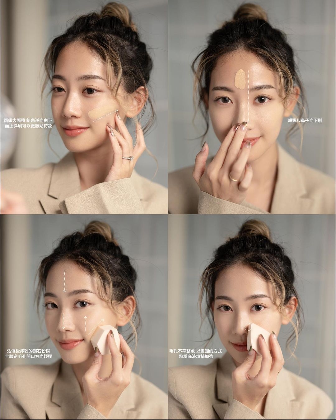同樣繼續毛孔逆向的方式,搭配沾濕後擰乾的鑽石粉撲,由上而下輕拍彈壓額頭和鼻樑、由下而上輕拍彈壓臉頰及鼻翼,然後在鼻翼兩側毛孔最明顯的地方,輕輕畫圓讓粉底液填補凹坑!3招同步出擊,「零粉感」從此逼走暗沉脫妝問題,從早玩到晚再嗨到隔天,臉上永遠漾著令人看到入迷的無瑕微霧奶油光!