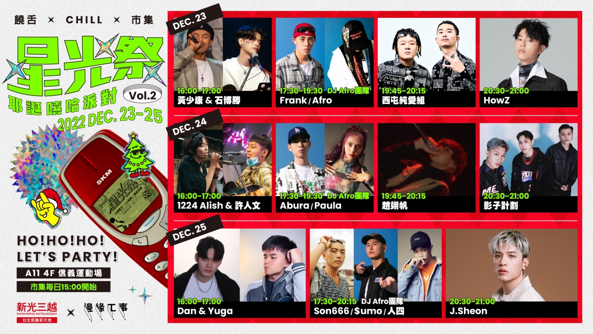 好評再加開!繼上回星光祭後,話題及詢問不斷,因此2022的最後再次旋風回歸,連續兩波段一次讓你看個過癮!邀請13大音樂串流熱播話題歌手R&B男神 J.Sheon、饒舌暖男HowZ、掀起少女追星狂熱風潮的Ozone12位熱門街頭藝人黃少康、陳相合、鄧韶軒還有14場饒舌歌手御用Afro Studio DJ秀,場場精彩,從下午開始音樂不停歇,給你最嗨的年末派對。新光三越APP獨享12/25、01/02限定,扣250 skm points即享限量VIP區資格近距離欣賞J.Sheon、Ozone演出。