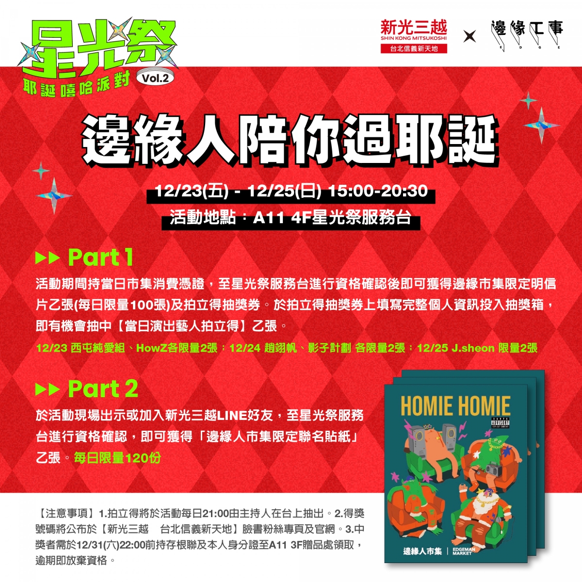 除了音樂怎麼還能少了市集?本次新光三越台北信義新天地與兩大市集聯手合作,潮人口袋必訪清單!12/23-12/25邊緣人市集,質感手作小物、經典古著、小眾藝術品,挖寶首選千萬別錯過;IG熱門品牌都在這!12/30-01/02 AFTERPARTY(不定期市集),韓系IP選物「Bring To Light」、質感飾品「Ivy's Studio」、精緻甜點「YOMASWEET」,兩場市集集結百家品牌參與,種類多到數不完,大撒幣行動就從這裡開始!新光三越會員獨享!邊緣人市集限定憑當日市集消費憑證就送「邊緣市集限定明信片乙張」(每日限量100張)及「當日演出藝人拍立得抽獎券」,加入新光三越LINE好友再送「邊緣人市集限量聯名貼紙」;AFTERPARTY限定憑當日消費憑證就送「當日演出藝人拍立得抽獎券」、打卡完成指定任務再送「新光三越X AFTERPARTY限定韓式拍貼機20元抵用金」。